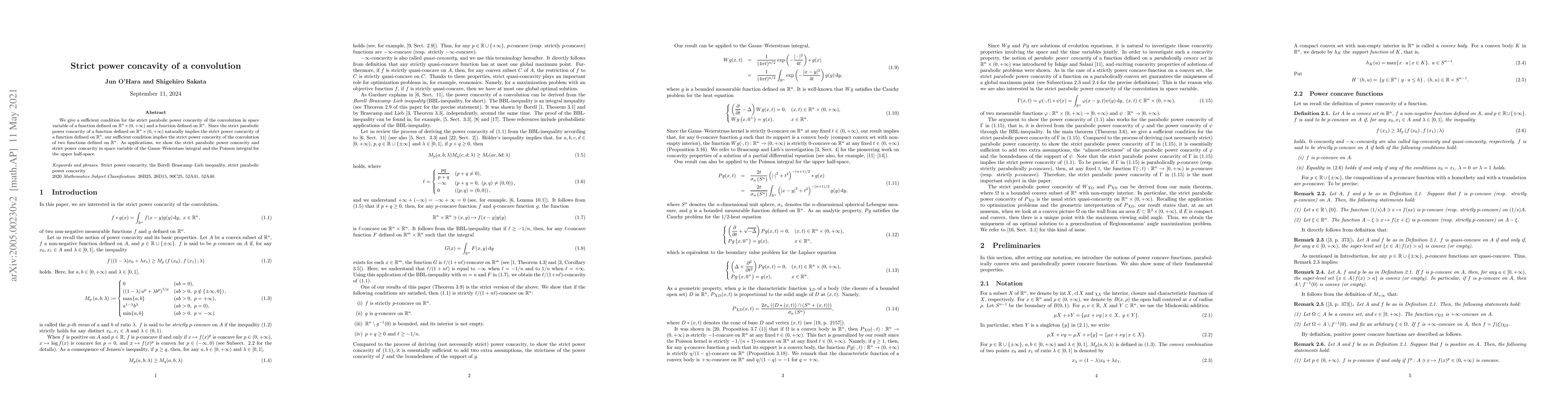 We give a sufficient condition for the strict parabolic power concavity of the convolution in space variable of a function defined on $\mathbb{R}^n \times (0,+\infty)$ and a function defined on $\mathbb{R}^n$. Since the strict parabolic power concavity of a function defined on $\mathbb{R}^n \times (0,+\infty)$ naturally implies the strict power concavity of a function defined on $\mathbb{R}^n$, our sufficient condition implies the strict power concavity of the convolution of two functions defined on $\mathbb{R}^n$. As applications, we show the strict parabolic power concavity and strict power concavity in space variable of the Gauss--Weierstass integral and the Poisson integral for the upper half-space.
