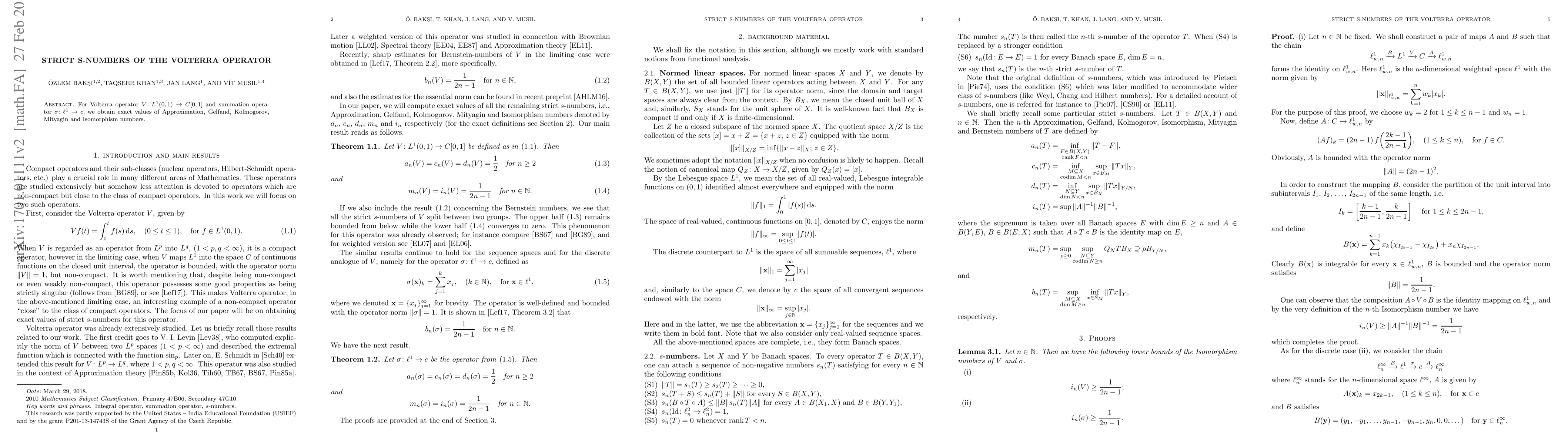 For Volterra operator $V\colon L^1(0,1) \to C[0,1]$ and summation operator $\sigma\colon \ell^1 \to c$, we obtain exact values of Approximation, Gelfand, Kolmogorov, Mityagin and Isomorphism numbers.