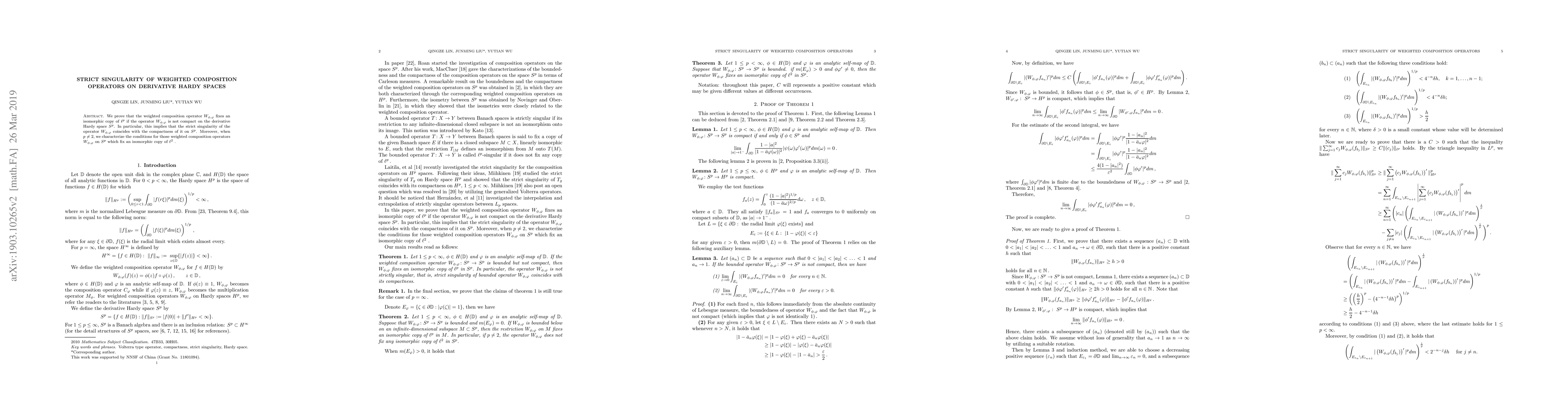 This research proves that non-compact weighted composition operators on derivative Hardy space S^p fix an isomorphic copy of $ell^p$. It establishes the equivalence of strict singularity with compactness of such operators on S^p, particularly for p ≠ 2. The paper also characterizes conditions under which these operators on S^p fix an isomorphic copy of $ell^2$.