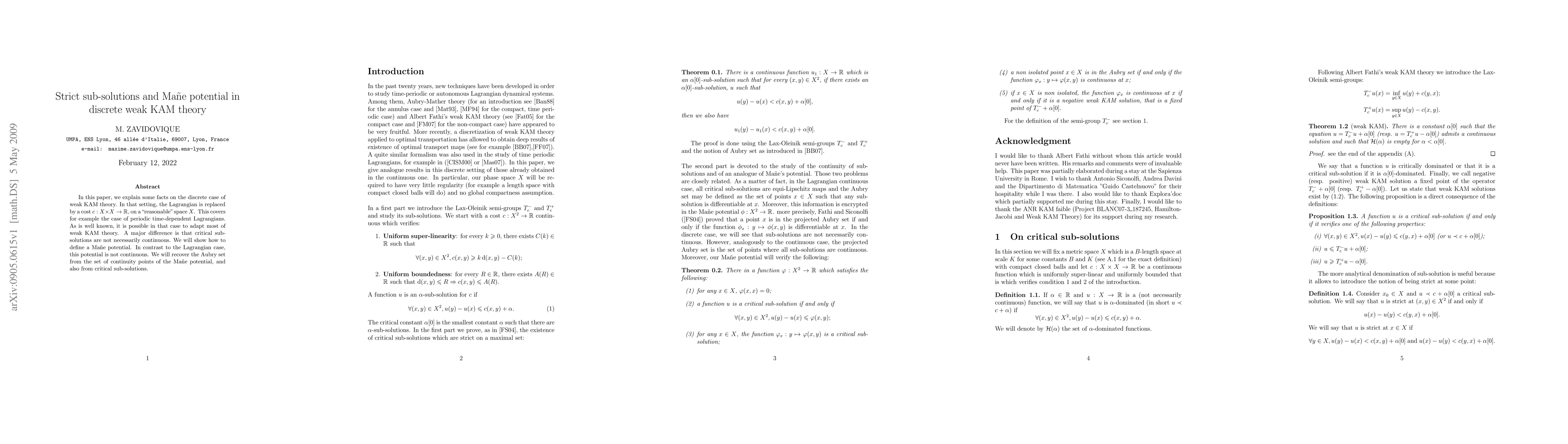 This paper explores the discrete weak KAM theory where the Lagrangian is replaced by a cost function. It introduces a non-continuous Ma~ne potential and demonstrates how to recover the Aubry set from the continuity points of this potential and from critical sub-solutions.