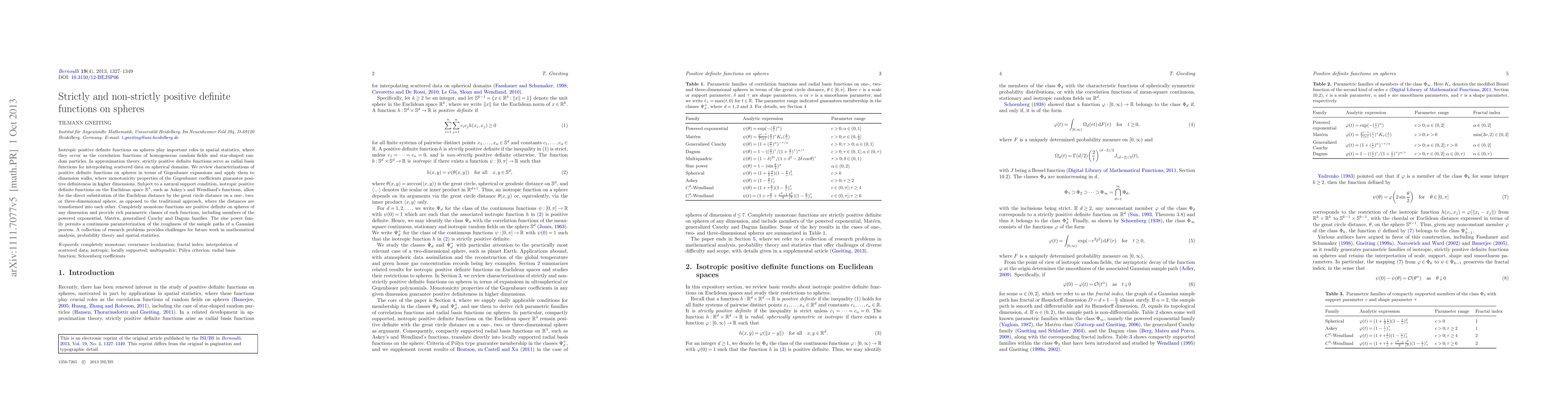 This paper reviews characterizations of positive definite functions on spheres, focusing on isotropic functions used in spatial statistics and interpolation theory. It explores the application of Gegenbauer expansions and discusses the direct substitution of Euclidean distances with great circle distances on spheres, highlighting the significance of completely monotone functions in this context.