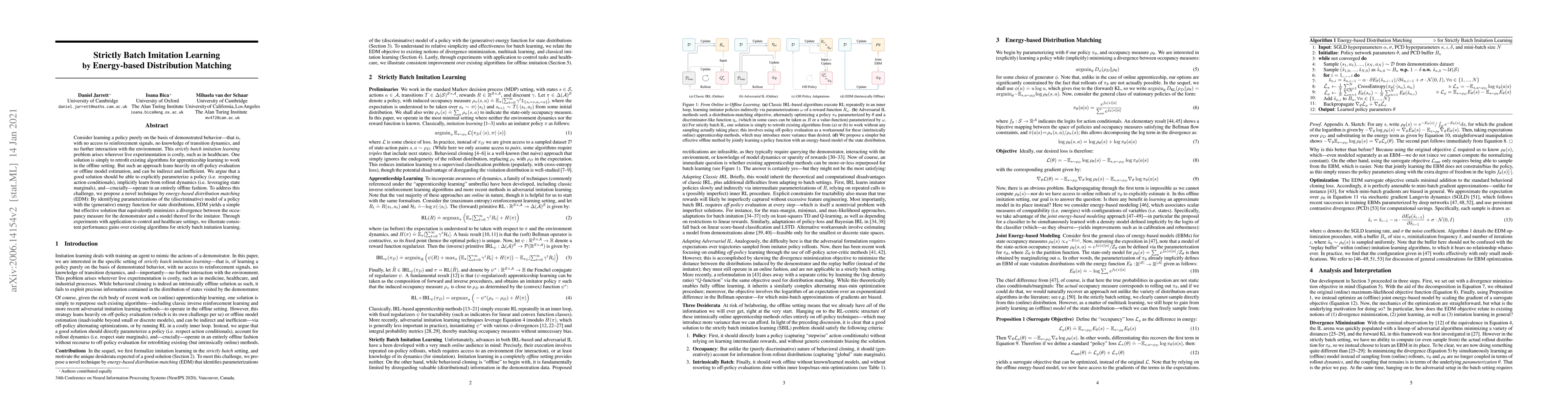 This paper proposes a novel energy-based distribution matching (EDM) technique for strictly batch imitation learning, which learns policies purely from demonstrated behavior without reinforcement signals. EDM effectively minimizes the divergence between the demonstrator's and imitator's occupancy measures, demonstrating consistent performance gains over existing offline methods in control and healthcare applications.