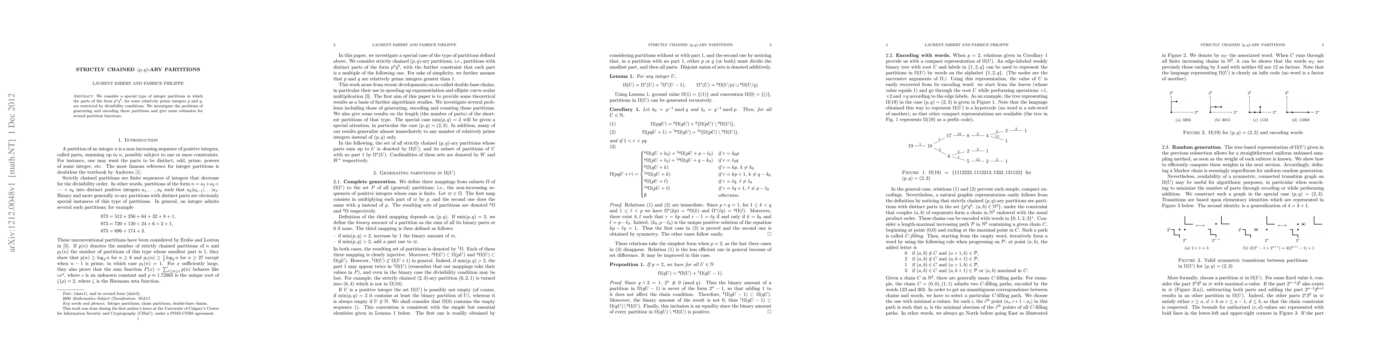 This paper explores strictly chained (p,q)-ary partitions where parts are of the form $p^aq^b$ with divisibility restrictions. It focuses on generating and encoding these partitions and provides estimates for associated partition functions.