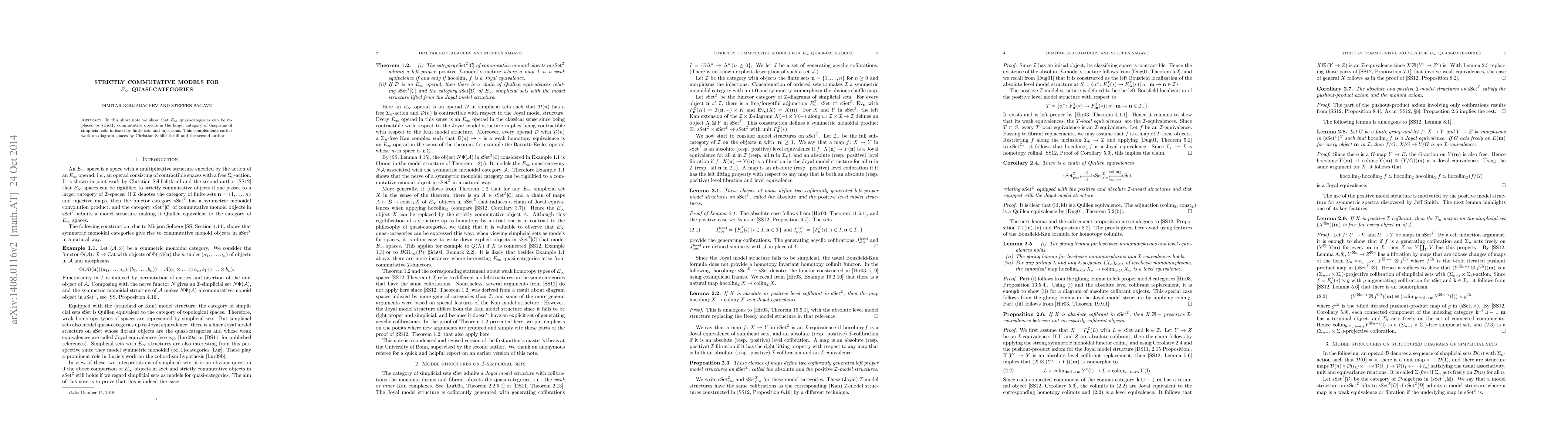 Summary: The paper demonstrates that E-infinity quasi-categories can be modeled using strictly commutative objects within the category of simplicial sets, enhancing previous work on diagram spaces by Schlichtkrull and the authors. This provides a more straightforward framework for understanding these complex structures.