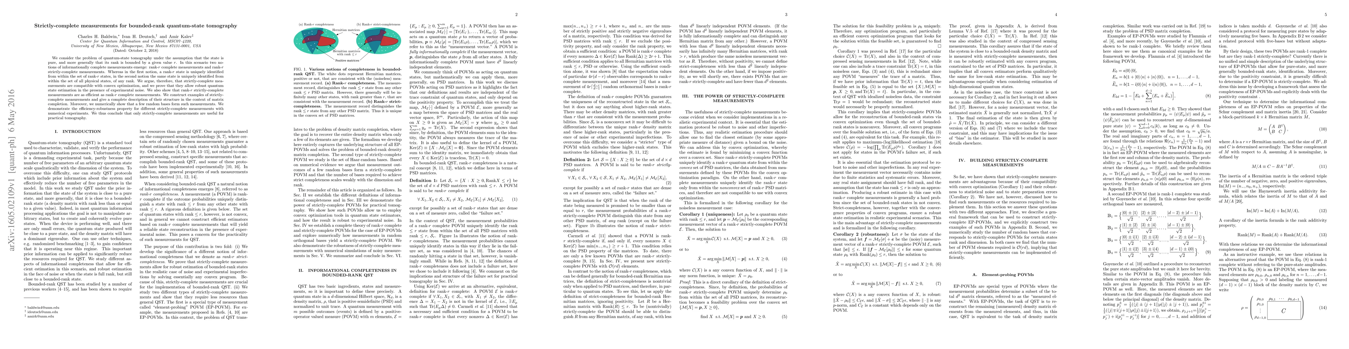 We consider the problem of quantum-state tomography under the assumption that the state is pure, and more generally that its rank is bounded by a given value $r$. In this scenario two notions of informationally complete measurements emerge: rank-$r$ complete measurements and rank-$r$ strictly-complete measurements. Whereas in the first notion, a rank-$r$ state is uniquely identified from within the set of rank-$r$ states, in the second notion the same state is uniquely identified from within the set of all physical states, of any rank. We argue, therefore, that strictly-complete measurements are compatible with convex optimization, and we prove that they allow robust quantum state estimation in the presence of experimental noise. We also show that rank-$r$ strictly-complete measurements are as efficient as rank-$r$ complete measurements. We construct examples of strictly-complete measurements and give a complete description of their structure in the context of matrix completion. Moreover, we numerically show that a few random bases form such measurements. We demonstrate the efficiency-robustness property for different strictly-complete measurements with numerical experiments. We thus conclude that only strictly-complete measurements are useful for practical tomography.