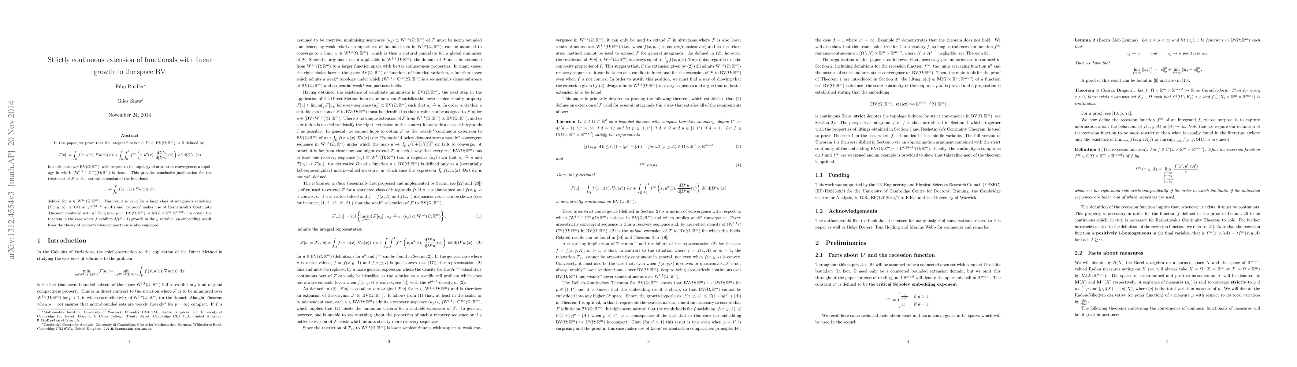 This paper proves the strict continuity of integral functionals defined on functions of bounded variation, extending them from weakly differentiable functions with linear growth. The result leverages Reshetnyak's Continuity Theorem and a lifting map, applicable to a broad class of integrands, and includes an embedding result for specific $d/(d-1)$ growth conditions.