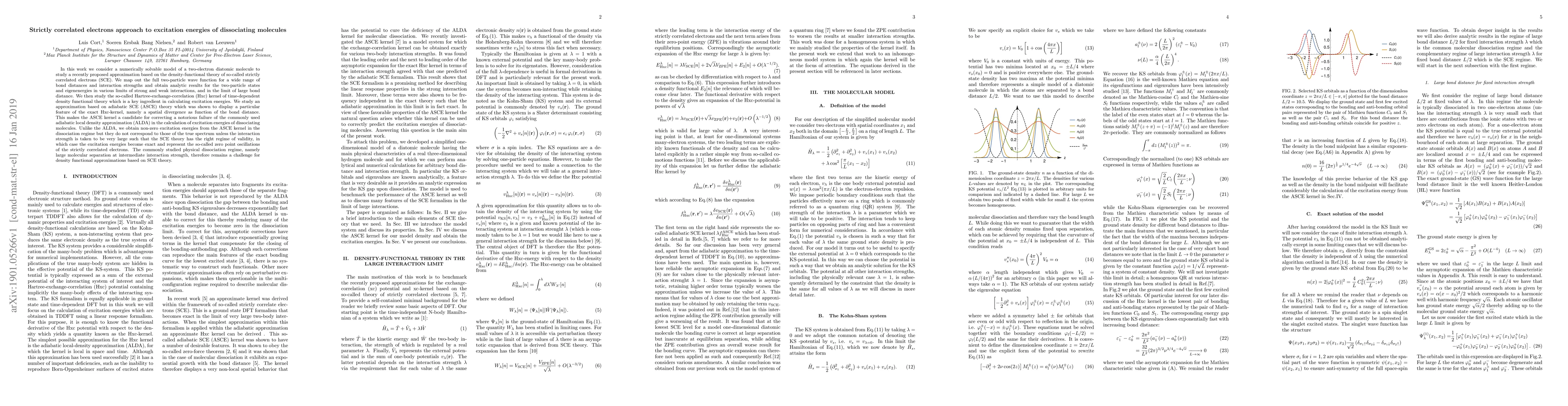 In this work we consider a numerically solvable model of a two-electron diatomic molecule to study a recently proposed approximation based on the density-functional theory of so-called strictly correlated electrons (SCE). We map out the full two-particle wave function for a wide range of bond distances and interaction strengths and obtain analytic results for the two-particle states and eigenenergies in various limits of strong and weak interactions, and in the limit of large bond distance. We then study the so-called Hartree-exchange-correlation (Hxc) kernel of time-dependent density functional theory which is a key ingredient in calculating excitation energies. We study an approximation based on adiabatic SCE (ASCE) theory which was shown to display a particular feature of the exact Hxc-kernel, namely a spatial divergence as function of the bond distance. This makes the ASCE kernel a candidate for correcting a notorious failure of the commonly used adiabatic local density approximation (ALDA) in the calculation of excitation energies of dissociating molecules. Unlike the ALDA, we obtain non-zero excitation energies from the ASCE kernel in the dissociation regime but they do not correspond to those of the true spectrum unless the interaction strength is taken to be very large such that the SCE theory has the right regime of validity, in which case the excitation energies become exact and represent the so-called zero point oscillations of the strictly correlated electrons. The commonly studied physical dissociation regime, namely large molecular separation at intermediate interaction strength, therefore remains a challenge for density functional approximations based on SCE theory.