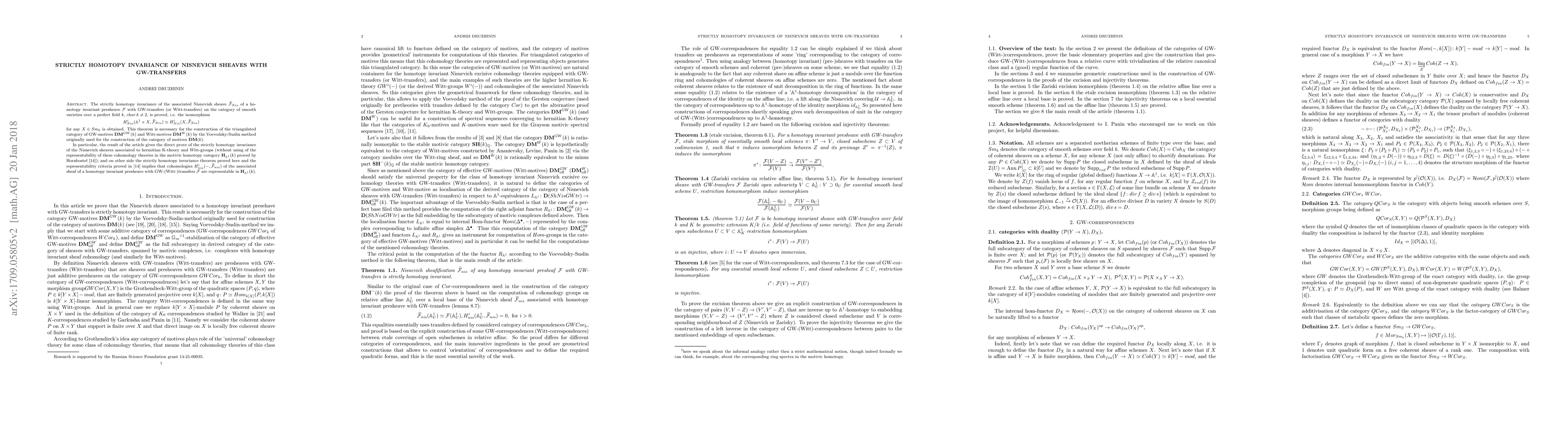 This paper proves the strictly homotopy invariance of Nisnevich sheaves associated with presheaves having GW-transfers on smooth varieties over a perfect field, establishing the isomorphism $H^i_{Nis}(\mathbb A^1\times X,\widetilde{\mathcal F}_{Nis})\simeq H^i_{Nis}(X,\widetilde{\mathcal F}_{Nis})$. This result is crucial for constructing the triangulated categories of GW-motives and Witt-motives.