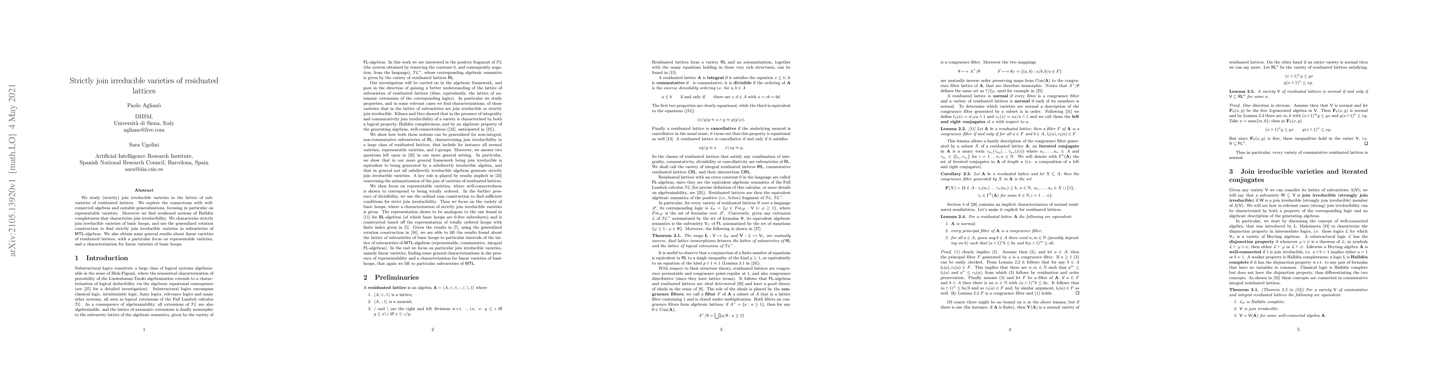 This paper investigates strictly join irreducible varieties within the lattice of subvarieties of residuated lattices, linking these to well-connected algebras and representable varieties. It introduces weakened notions of Hallden completeness for characterizing join irreducibility and explores these concepts in the context of basic hoops and MTL-algebras.