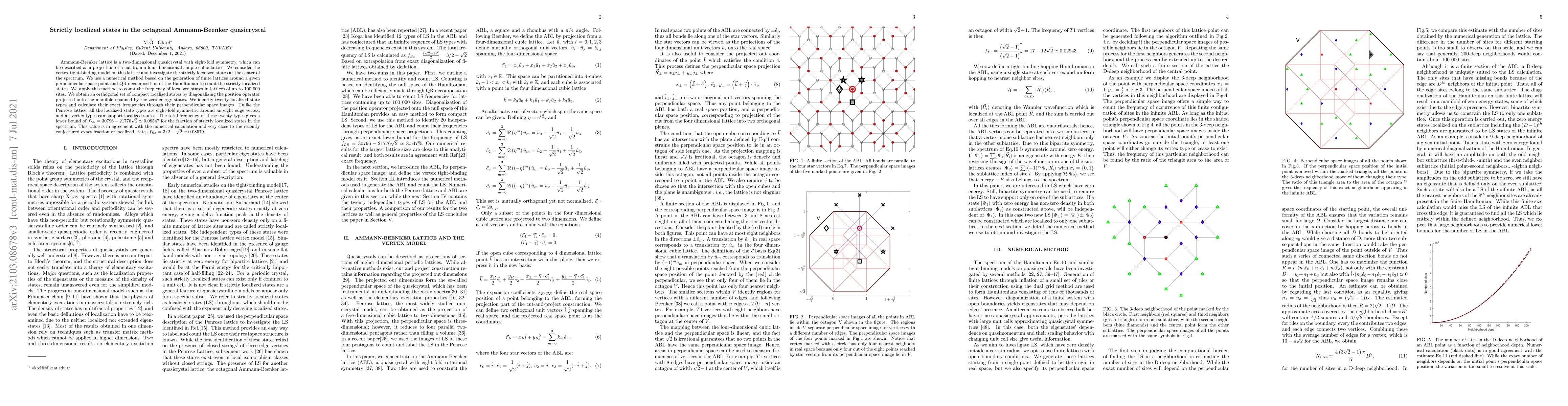 This paper investigates strictly localized states in the Ammann-Beenker quasicrystal lattice using a vertex tight-binding model and numerical methods. It identifies twenty types of eight-fold symmetric localized states, confirming a theoretical lower bound for the fraction of localized states in the spectrum, closely matching recent conjectures.