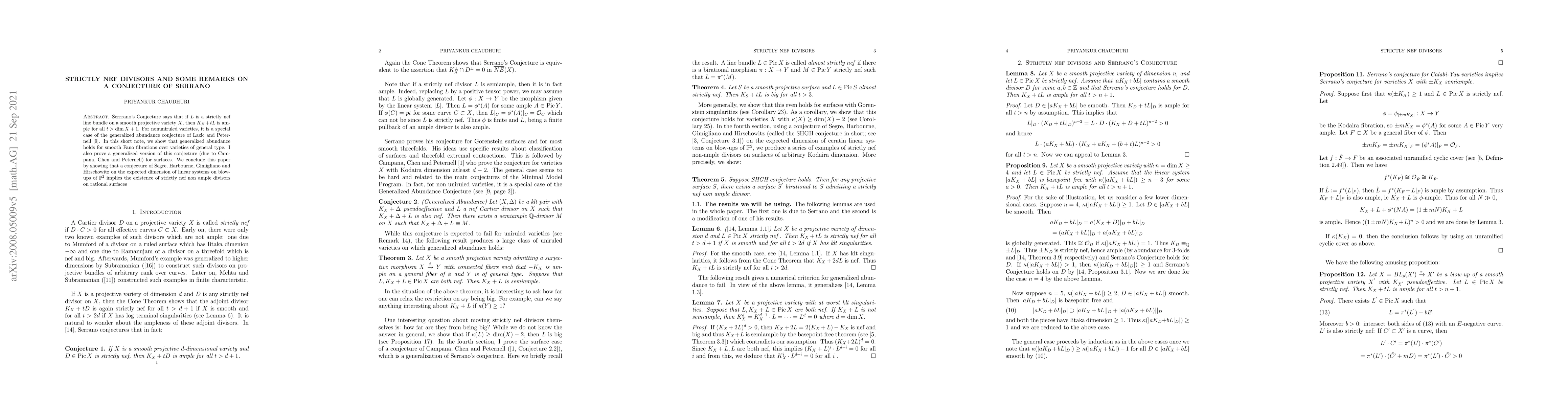 The paper proves specific cases of Serrano's conjecture about strictly nef line bundles on smooth projective varieties and a generalized version for surfaces. It also provides examples of strictly nef but non-ample divisors on surfaces under the assumption of the SHGH conjecture.