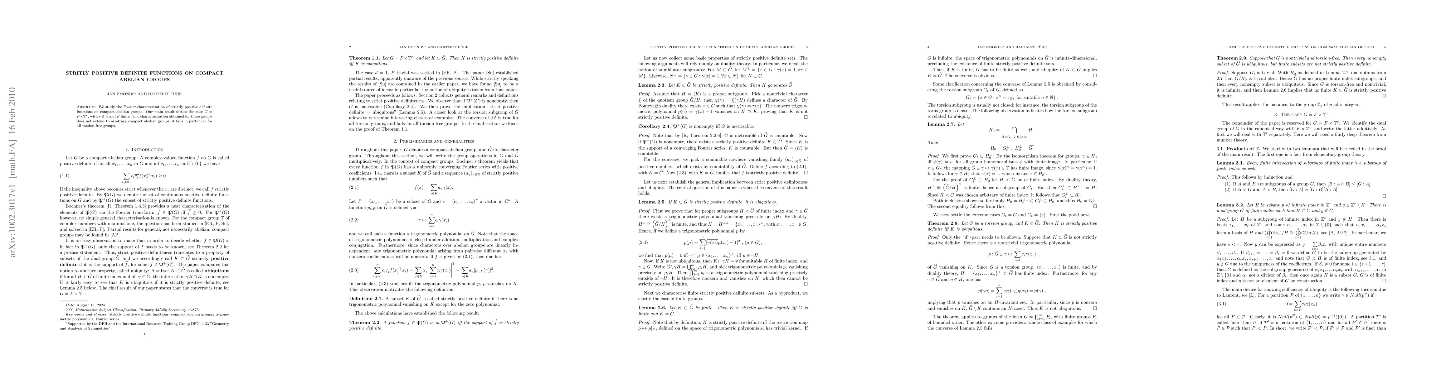 This paper characterizes strictly positive definite functions on compact abelian groups, specifically proving the Fourier characterization for groups of the form $G = F \times \mathbb{T}^r$. The results do not extend to all compact abelian groups, notably failing for torsion-free groups.
