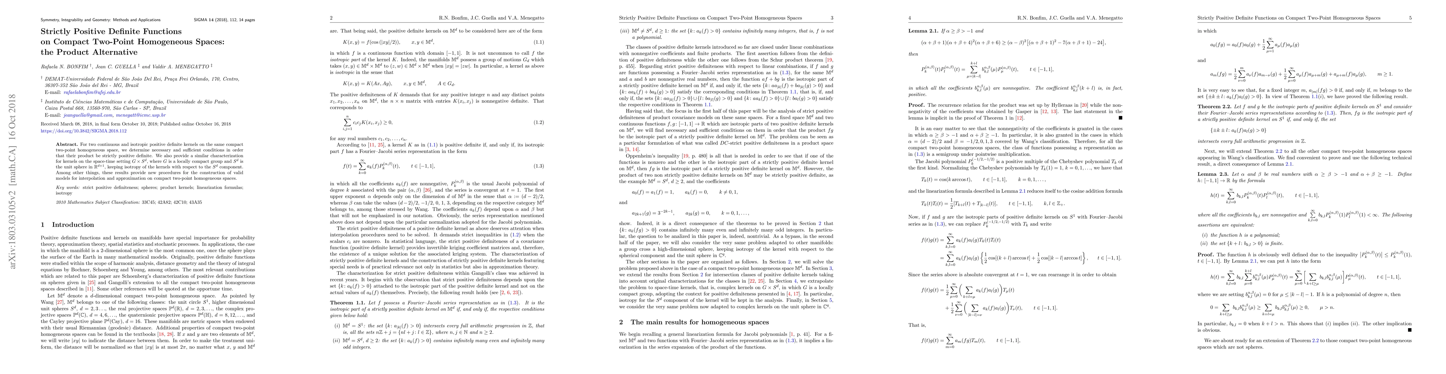 This paper establishes necessary and sufficient conditions for the product of two continuous, isotropic positive definite kernels on compact two-point homogeneous spaces to be strictly positive definite. It also extends these conditions to a space-time setting involving a locally compact group and the unit sphere, providing new methods for constructing valid interpolation and approximation models.