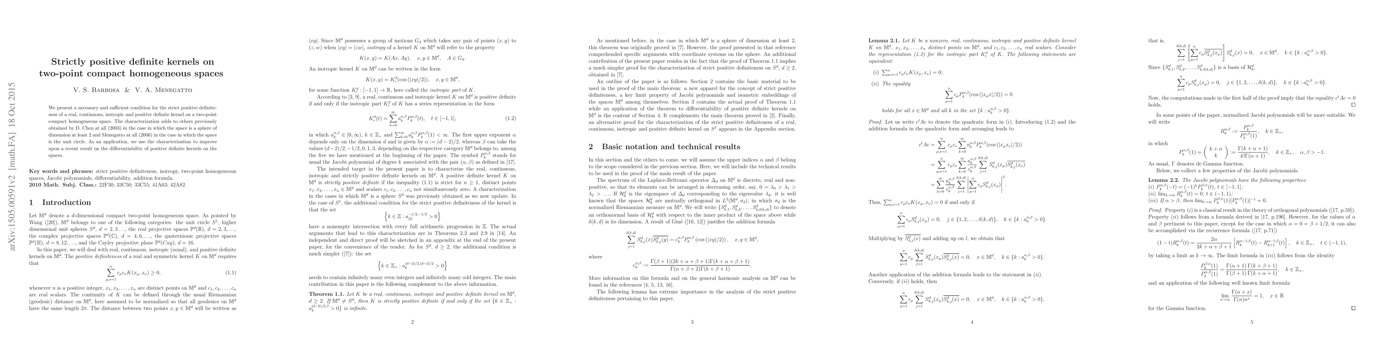 The paper establishes a new necessary and sufficient condition for strict positive definiteness of kernels on two-point compact homogeneous spaces, building upon previous work for spheres and circles.