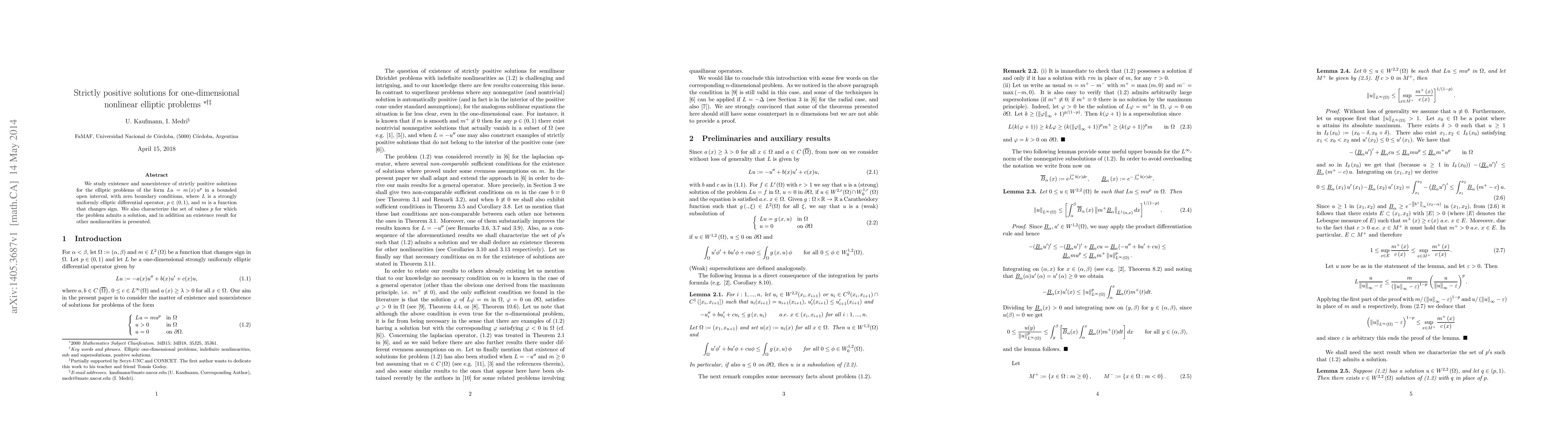 This paper investigates the existence and nonexistence of strictly positive solutions for one-dimensional nonlinear elliptic problems of the form $Lu=m(x)u^p$ in bounded intervals, with zero boundary conditions, where $L$ is a strongly uniformly elliptic operator, $p\in(0,1)$, and $m$ is a sign-changing function. It also characterizes the values of $p$ that allow for solutions and presents an existence result for other nonlinearities.