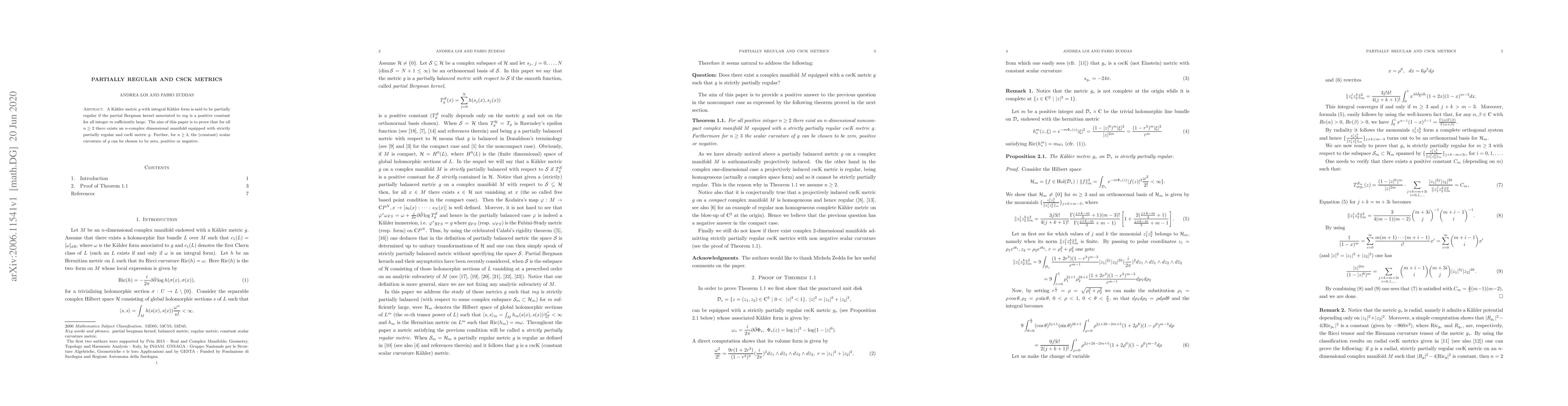 A Kaehler metric $g$ with integral Kaehler form is said to be partially regular if the partial Bergman kernel associated to mg is a positive constant for all integer m sufficiently large. The aim of this paper is to prove that for all n\geq 2 there exists an n-complex dimensional manifold equipped with strictly partially regular and cscK metric g. Further, for n\geq 3, the (constant) scalar curvature of g can be chosen to be zero, positive or negative.