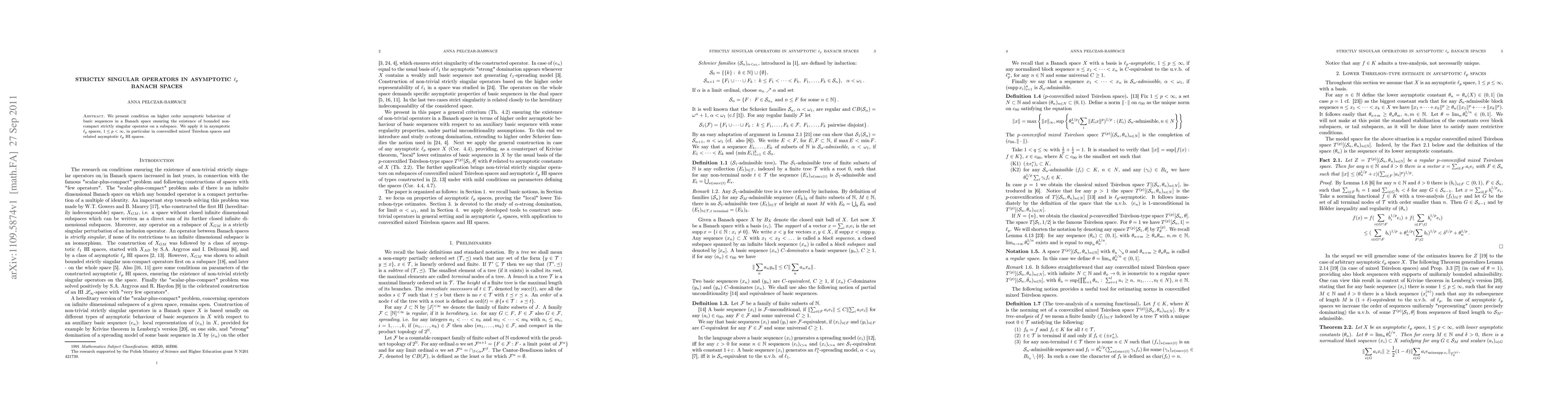 This paper explores conditions for the existence of strictly singular operators in asymptotic $\ell_p$ Banach spaces, focusing on higher order asymptotic behavior of basic sequences and applying the findings to convexified mixed Tsirelson spaces and related asymptotic $\ell_p$ HI spaces.