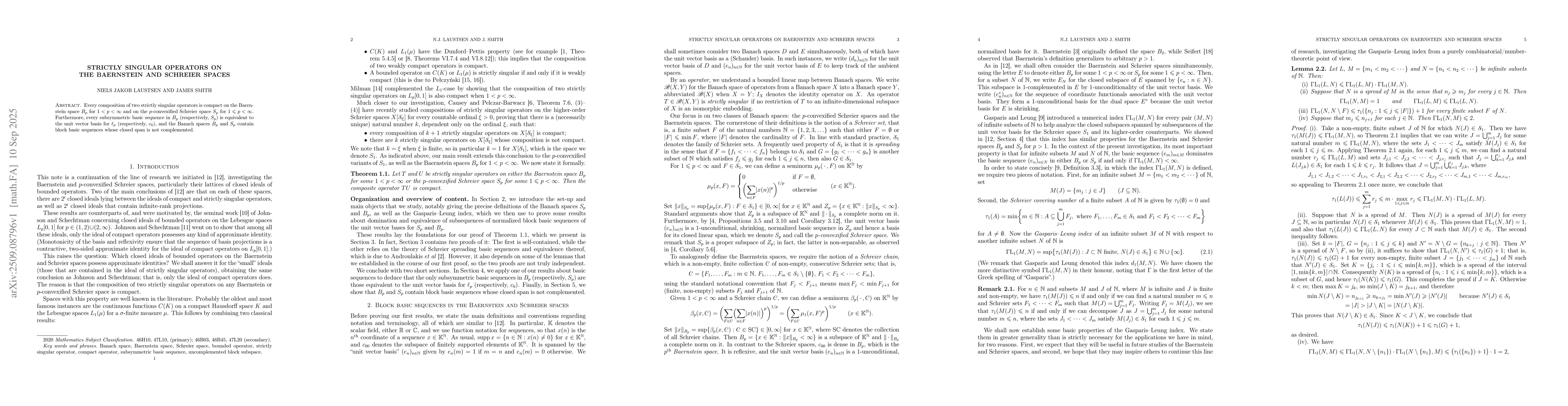Every composition of two strictly singular operators is compact on the Baernstein space $B_p$ for $1 < p < \infty$ and on the $p$-convexified Schreier space $S_{p}$ for $1 \leq p < \infty$. Furthermore, every subsymmetric basic sequence in $B_p$ (respectively, $S_p$) is equivalent to the unit vector basis for $\ell_p$ (respectively, $c_0$), and the Banach spaces $B_p$ and $S_p$ contain block basic sequences whose closed span is not complemented.
