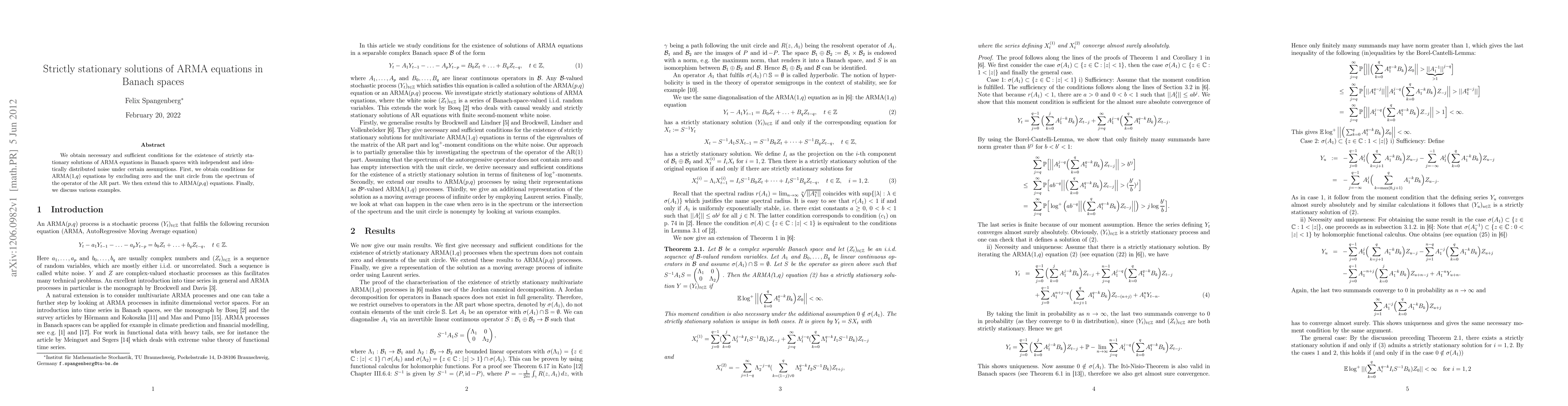 This paper provides necessary and sufficient conditions for strictly stationary solutions of ARMA equations in Banach spaces, focusing on ARMA(1,$q$) and extending to ARMA($p$,$q$), under assumptions excluding zero and the unit circle from the AR operator's spectrum. Various examples are also discussed to illustrate the findings.