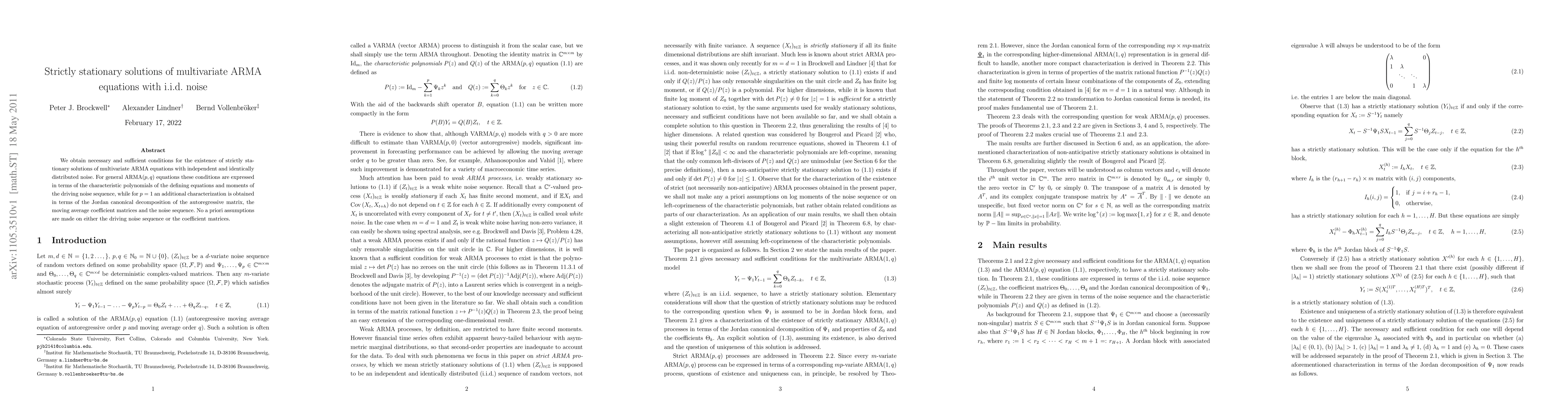 This paper establishes necessary and sufficient conditions for the existence of strictly stationary solutions in multivariate ARMA equations with i.i.d. noise, expressed via characteristic polynomials and moments of the noise, with additional insights for ARMA(1,q) models using Jordan canonical decomposition. No assumptions are made on the noise or coefficient matrices.