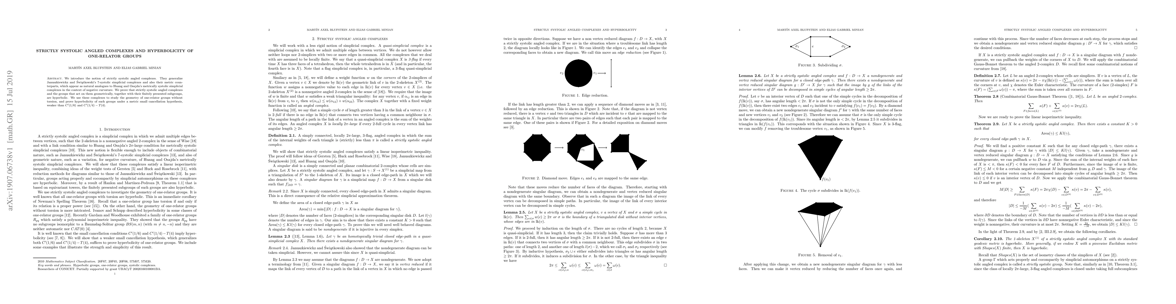 This paper introduces strictly systolic angled complexes, which generalize previous systolic complexes, and proves that these complexes and their associated one-relator groups without torsion are hyperbolic under a weaker metric small cancellation condition than $C'(1/6)$ and $C'(1/4)-T(4)$. The complexes serve as a bridge between systolic geometry and hyperbolic group theory.