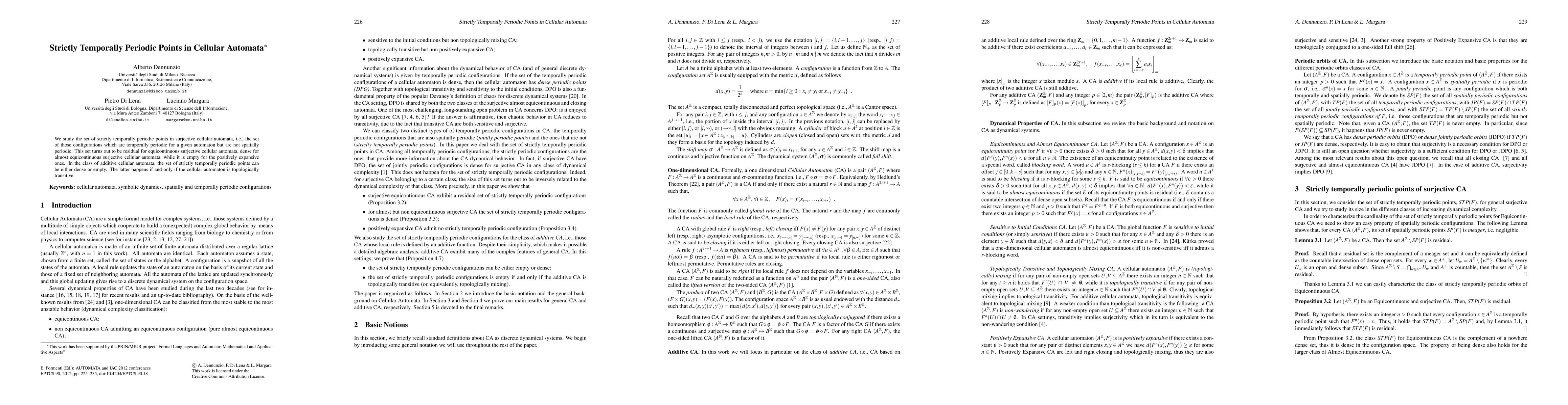 This paper investigates strictly temporally periodic points in surjective cellular automata, finding that such points are dense in almost equicontinuous automata but absent in positively expansive ones. In additive cellular automata, the presence of strictly periodic points depends on whether the automaton is topologically transitive.