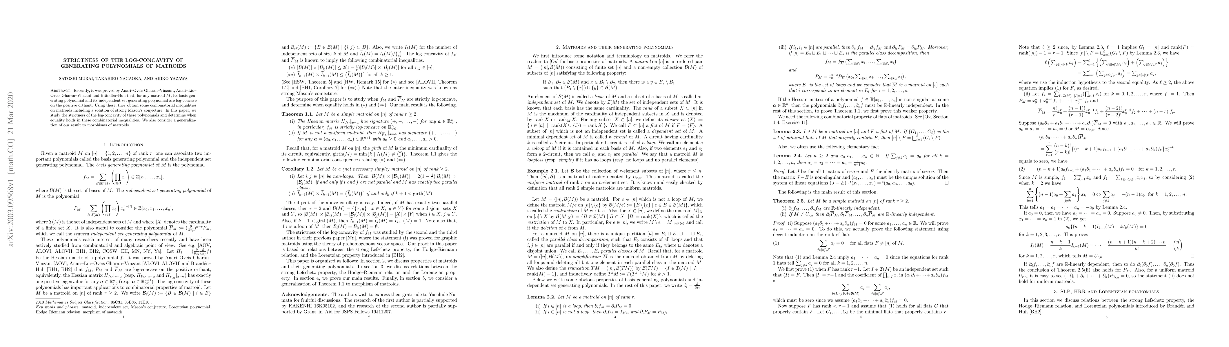 Recently, it was proved by Anari-Oveis Gharan-Vinzant, Anari-Liu-Oveis Gharan-Vinzant and Br\"{a}nd\'{e}n-Huh that, for any matroid $M$, its basis generating polynomial and its independent set generating polynomial are log-concave on the positive orthant. Using these, they obtain some combinatorial inequalities on matroids including a solution of strong Mason's conjecture. In this paper, we study the strictness of the log-concavity of these polynomials and determine when equality holds in these combinatorial inequalities. We also consider a generalization of our result to morphisms of matroids.