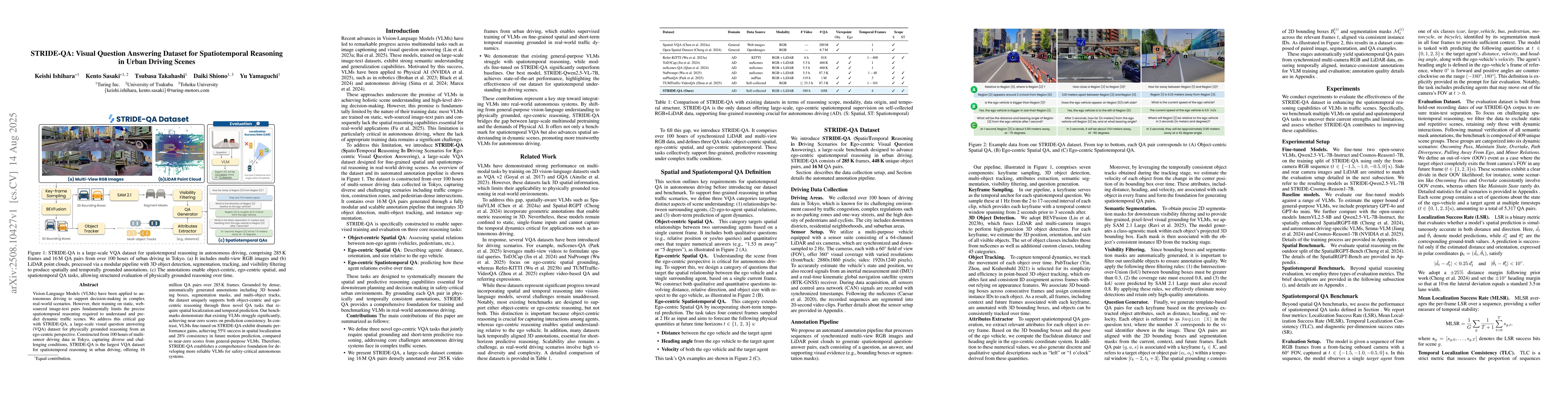 Vision-Language Models (VLMs) have been applied to autonomous driving to support decision-making in complex real-world scenarios. However, their training on static, web-sourced image-text pairs fundamentally limits the precise spatiotemporal reasoning required to understand and predict dynamic traffic scenes. We address this critical gap with STRIDE-QA, a large-scale visual question answering (VQA) dataset for physically grounded reasoning from an ego-centric perspective. Constructed from 100 hours of multi-sensor driving data in Tokyo, capturing diverse and challenging conditions, STRIDE-QA is the largest VQA dataset for spatiotemporal reasoning in urban driving, offering 16 million QA pairs over 285K frames. Grounded by dense, automatically generated annotations including 3D bounding boxes, segmentation masks, and multi-object tracks, the dataset uniquely supports both object-centric and ego-centric reasoning through three novel QA tasks that require spatial localization and temporal prediction. Our benchmarks demonstrate that existing VLMs struggle significantly, achieving near-zero scores on prediction consistency. In contrast, VLMs fine-tuned on STRIDE-QA exhibit dramatic performance gains, achieving 55% success in spatial localization and 28% consistency in future motion prediction, compared to near-zero scores from general-purpose VLMs. Therefore, STRIDE-QA establishes a comprehensive foundation for developing more reliable VLMs for safety-critical autonomous systems.