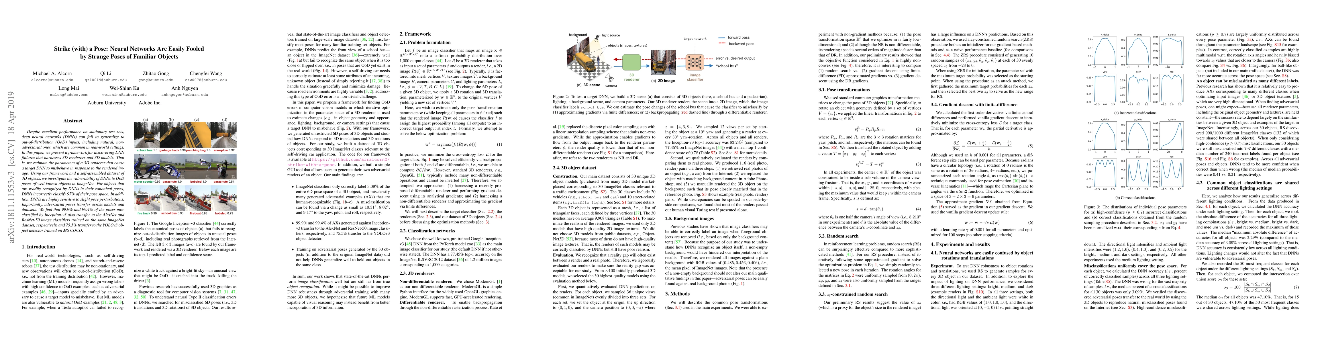 This research reveals deep neural networks (DNNs) struggle with recognizing familiar objects in unconventional poses, misclassifying 97% of such poses. The study uses 3D rendering and models to discover DNN failures, finding adversarial poses transfer across different DNN models and datasets.