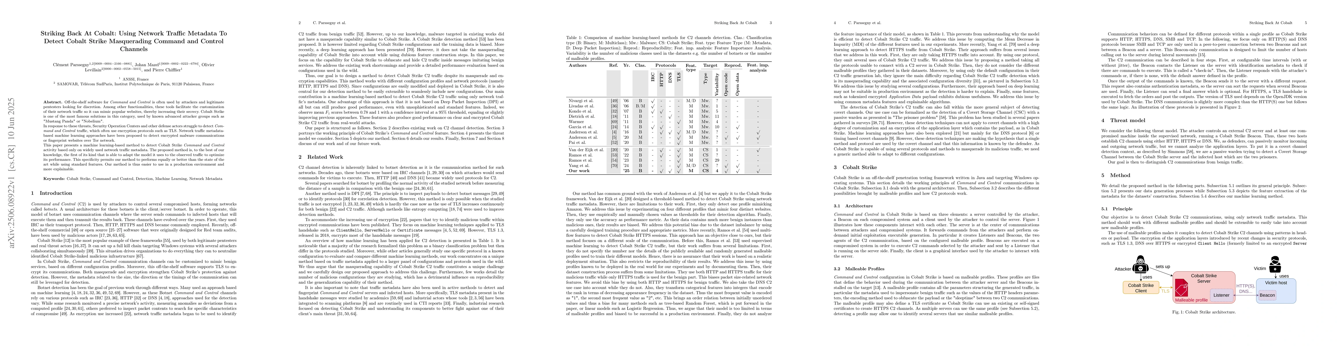 Off-the-shelf software for Command and Control is often used by attackers and legitimate pentesters looking for discretion. Among other functionalities, these tools facilitate the customization of their network traffic so it can mimic popular websites, thereby increasing their secrecy. Cobalt Strike is one of the most famous solutions in this category, used by known advanced attacker groups such as "Mustang Panda" or "Nobelium". In response to these threats, Security Operation Centers and other defense actors struggle to detect Command and Control traffic, which often use encryption protocols such as TLS. Network traffic metadata-based machine learning approaches have been proposed to detect encrypted malware communications or fingerprint websites over Tor network. This paper presents a machine learning-based method to detect Cobalt Strike Command and Control activity based only on widely used network traffic metadata. The proposed method is, to the best of our knowledge, the first of its kind that is able to adapt the model it uses to the observed traffic to optimize its performance. This specificity permits our method to performs equally or better than the state of the art while using standard features. Our method is thus easier to use in a production environment and more explainable.