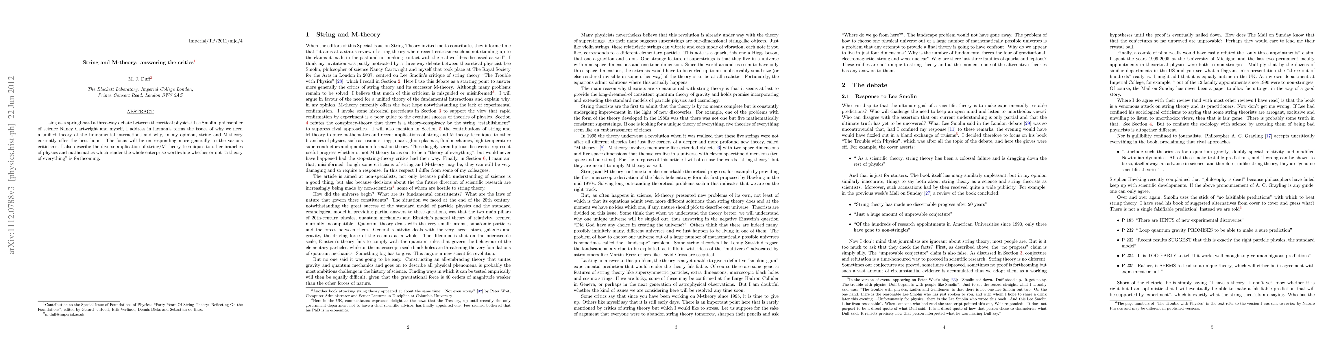 Using as a springboard a three-way debate between theoretical physicist Lee Smolin, philosopher of science Nancy Cartwright and myself, I address in layman's terms the issues of why we need a unified theory of the fundamental interactions and why, in my opinion, string and M-theory currently offer the best hope. The focus will be on responding more generally to the various criticisms. I also describe the diverse application of string/M-theory techniques to other branches of physics and mathematics which render the whole enterprise worthwhile whether or not "a theory of everything" is forthcoming.