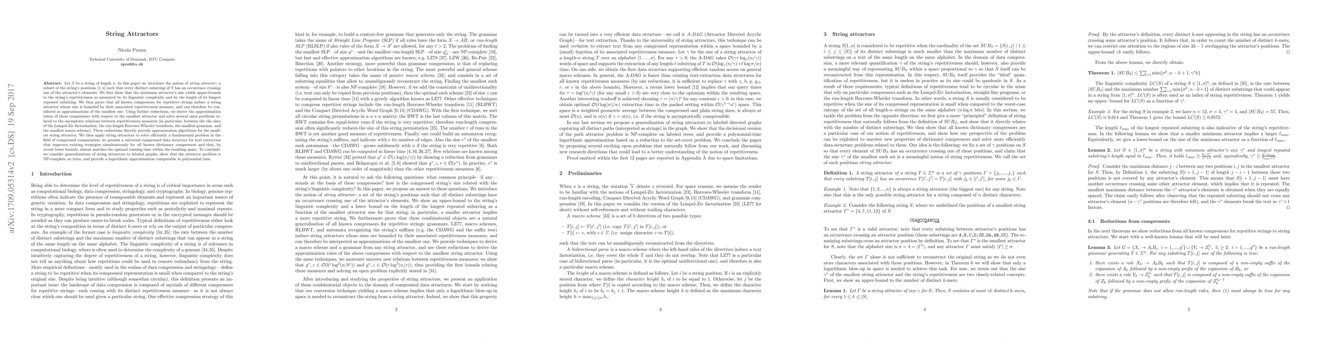 This paper introduces the concept of string attractors, subsets of string positions ensuring every substring crosses at least one attractor element, and shows their relation to string repetitiveness. It also presents approximation algorithms for finding the smallest string attractor and applies this concept to improve compressed data structures for text extraction.