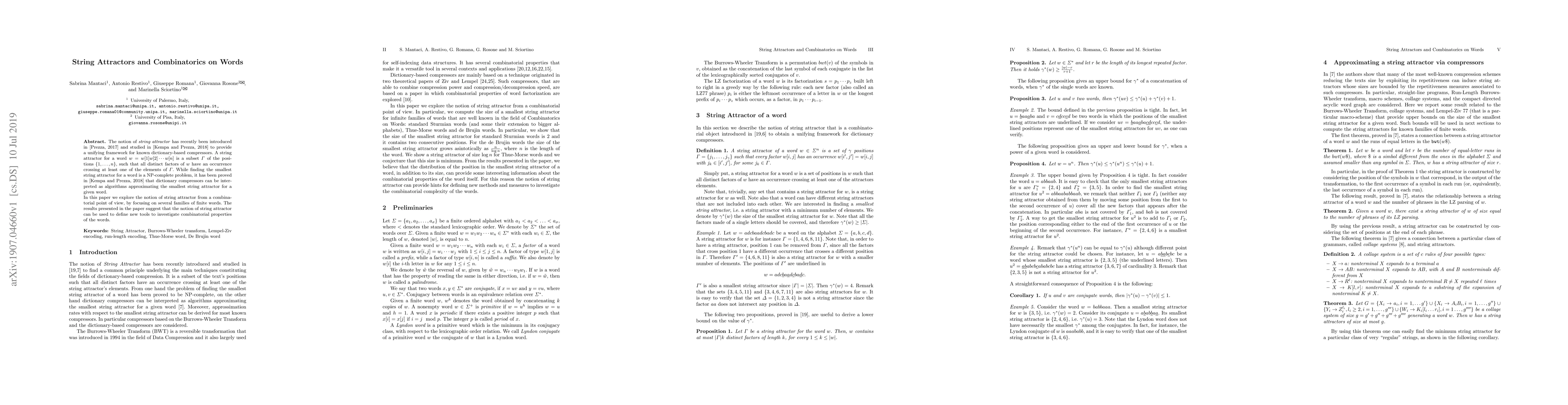 The notion of \emph{string attractor} has recently been introduced in [Prezza, 2017] and studied in [Kempa and Prezza, 2018] to provide a unifying framework for known dictionary-based compressors. A string attractor for a word $w=w[1]w[2]\cdots w[n]$ is a subset $\Gamma$ of the positions $\{1,\ldots,n\}$, such that all distinct factors of $w$ have an occurrence crossing at least one of the elements of $\Gamma$. While finding the smallest string attractor for a word is a NP-complete problem, it has been proved in [Kempa and Prezza, 2018] that dictionary compressors can be interpreted as algorithms approximating the smallest string attractor for a given word. In this paper we explore the notion of string attractor from a combinatorial point of view, by focusing on several families of finite words. The results presented in the paper suggest that the notion of string attractor can be used to define new tools to investigate combinatorial properties of the words.