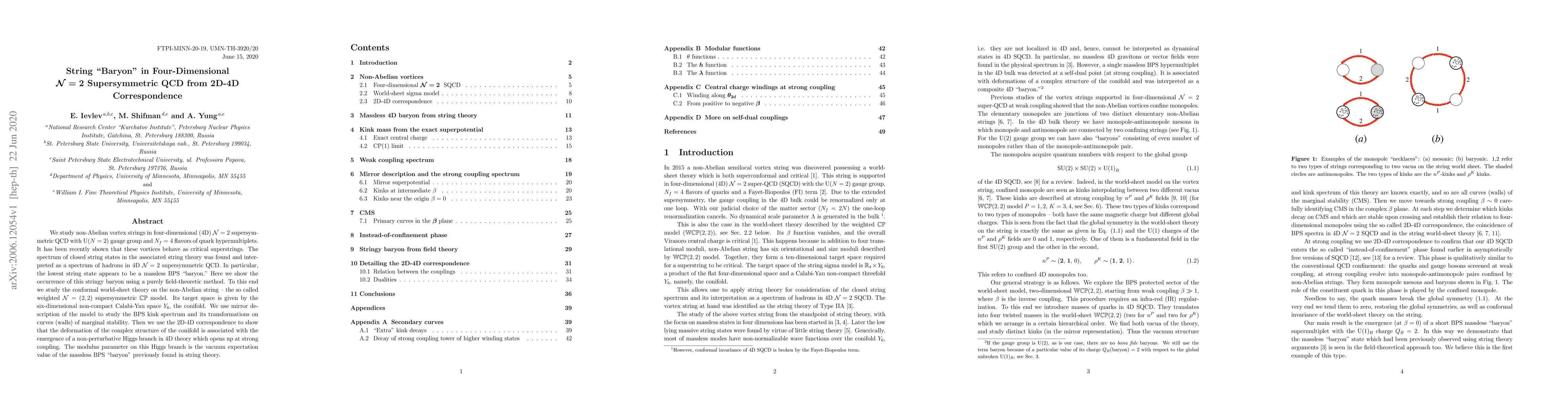 The paper investigates non-Abelian vortex strings in 4D $\mathcal{N} = 2$ supersymmetric QCD, showing their behavior as critical superstrings and linking their spectrum to hadrons in the theory. It identifies a massless BPS "baryon" state in string theory and demonstrates its occurrence using a field-theoretic method and the 2D-4D correspondence.