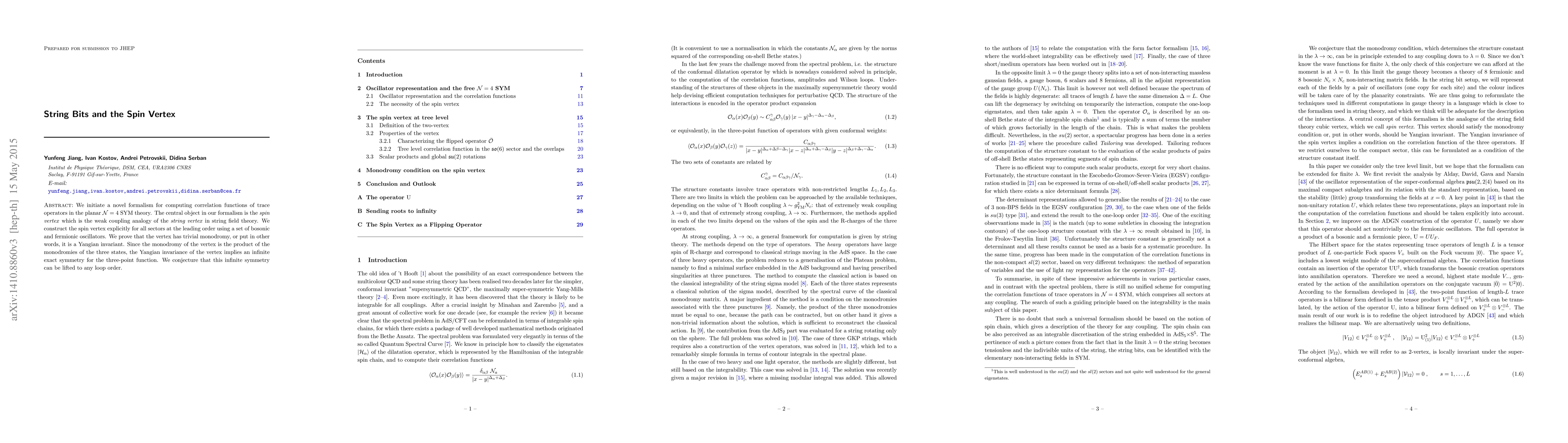 We initiate a novel formalism for computing correlation functions of trace operators in the planar N=4 SYM theory. The central object in our formalism is the spin vertex, which is the weak coupling analogy of the string vertex in string field theory. We construct the spin vertex explicitly for all sectors at the leading order using a set of bosonic and fermionic oscillators. We prove that the vertex has trivial monodromy, or put in other words, it is a Yangian invariant. Since the monodromy of the vertex is the product of the monodromies of the three states, the Yangian invariance of the vertex implies an infinite exact symmetry for the three-point function. We conjecture that this infinite symmetry can be lifted to any loop order.