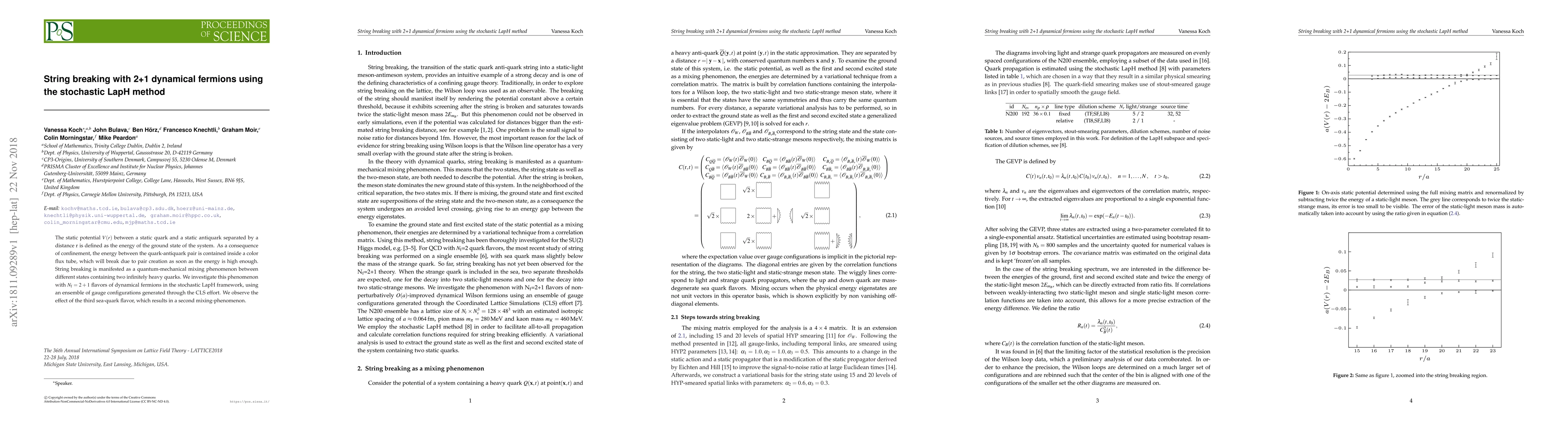 The static potential $V(r)$ between a static quark and a static antiquark separated by a distance r is defined as the energy of the ground state of the system. As a consequence of confinement, the energy between the quark-antiquark pair is contained inside a color flux tube, which will break due to pair creation as soon as the energy is high enough. String breaking is manifested as a quantum-mechanical mixing phenomenon between different states containing two infinitely heavy quarks. We investigate this phenomenon with $N_\mathrm{f}=2+1$ flavors of dynamical fermions in the stochastic LapH framework, using an ensemble of gauge configurations generated through the CLS effort. We observe the effect of the third sea-quark flavor, which results in a second mixing-phenomenon.