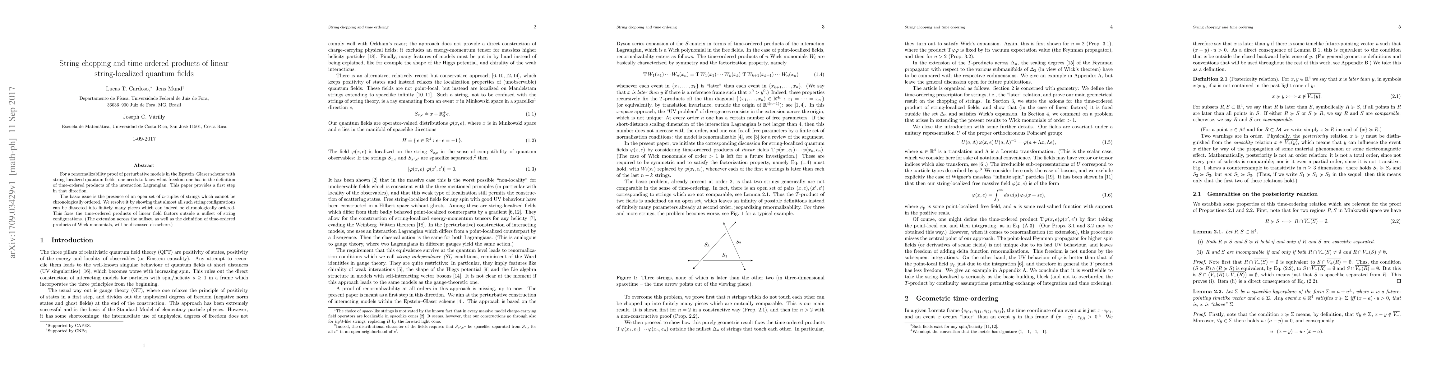 This paper addresses the renormalizability of perturbative models using string-localized quantum fields, focusing on the definition of time-ordered products. It resolves the issue of non-chronologically ordered string configurations by demonstrating that almost all such configurations can be dissected into chronologized pieces, thereby fixing the time-ordered products outside a nullset of configurations.
