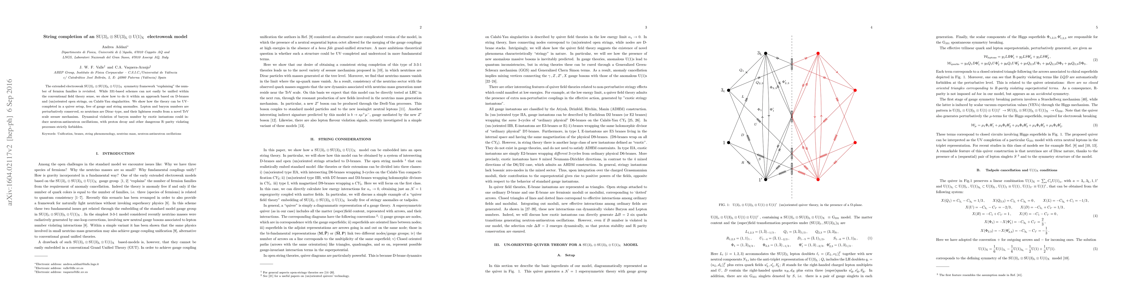 This paper explores the UV completion of an extended $\mathrm{SU(3)_c \otimes SU(3)_L \otimes U(1)_X}$ electroweak model using D-branes and open strings on Calabi-Yau singularities, achieving a gauge and string anomaly-free quiver setup. It proposes a novel TeV-scale seesaw mechanism for neutrino lightness and forbids dangerous R-parity violating processes.
