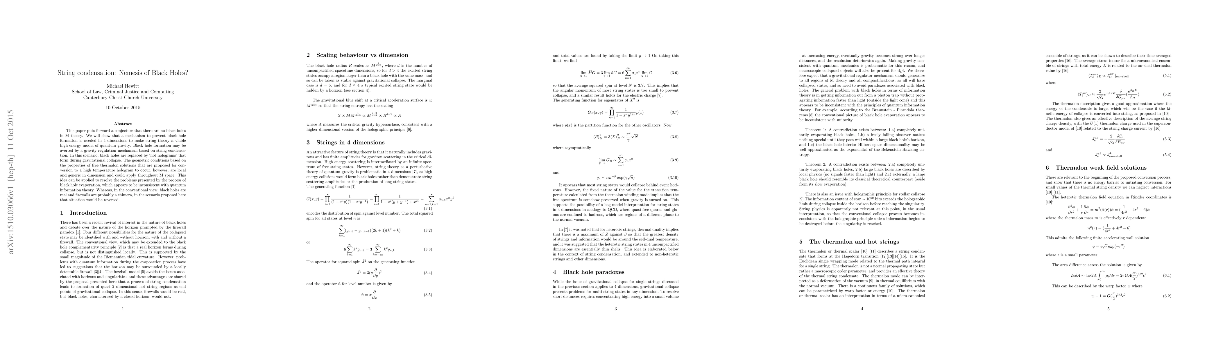 This paper puts forward a conjecture that there are no black holes in M theory. We will show that a mechanism to prevent black hole formation is needed in 4 dimensions to make string theory a viable high energy model of quantum gravity. Black hole formation may be averted by a gravity regulation mechanism based on string condensation. In this scenario, black holes are replaced by `hot holograms' that form during gravitational collapse. The geometric conditions based on the properties of free thermalon solutions that are proposed for conversion to a high temperature hologram to occur, however, are local and generic in dimension and could apply throughout M space. This idea can be applied to resolve the problems presented by the process of black hole evaporation, which appears to be inconsistent with quantum information theory. Whereas, in the conventional view, black holes are real and firewalls are probably a chimera, in the scenario proposed here that situation would be reversed.