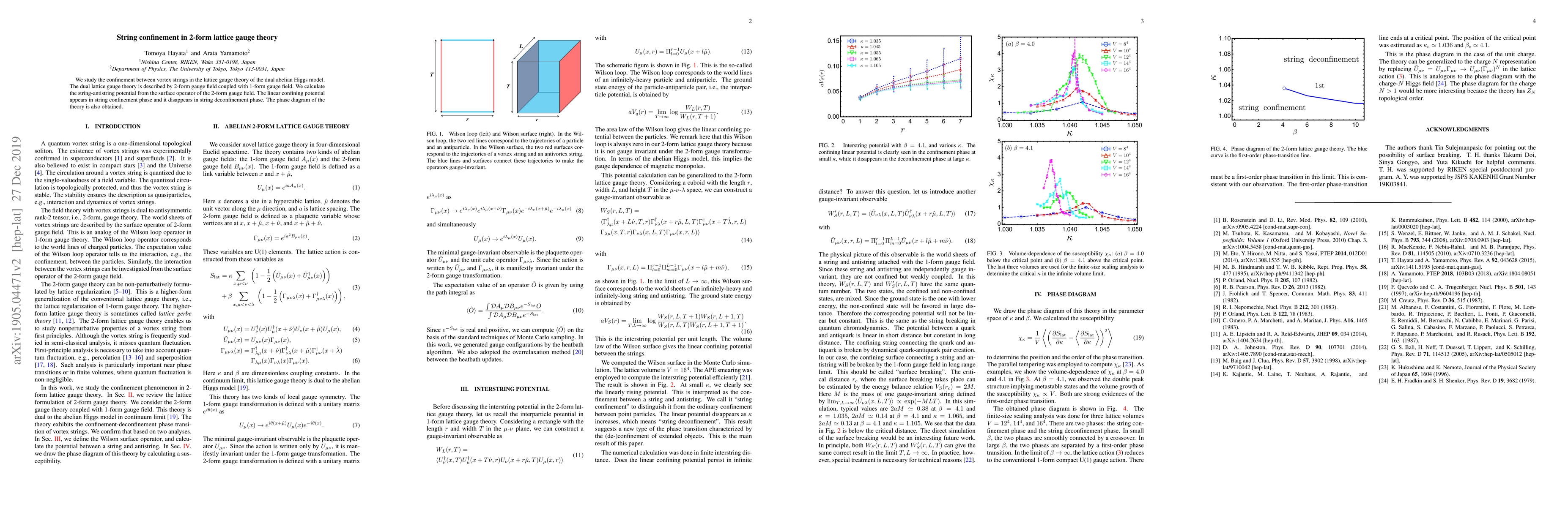 This work distinguishes itself by focusing on the confinement of extended objects (strings) rather than point particles, and by using a 2-form gauge field to describe the dual lattice gauge theory of the abelian Higgs model.