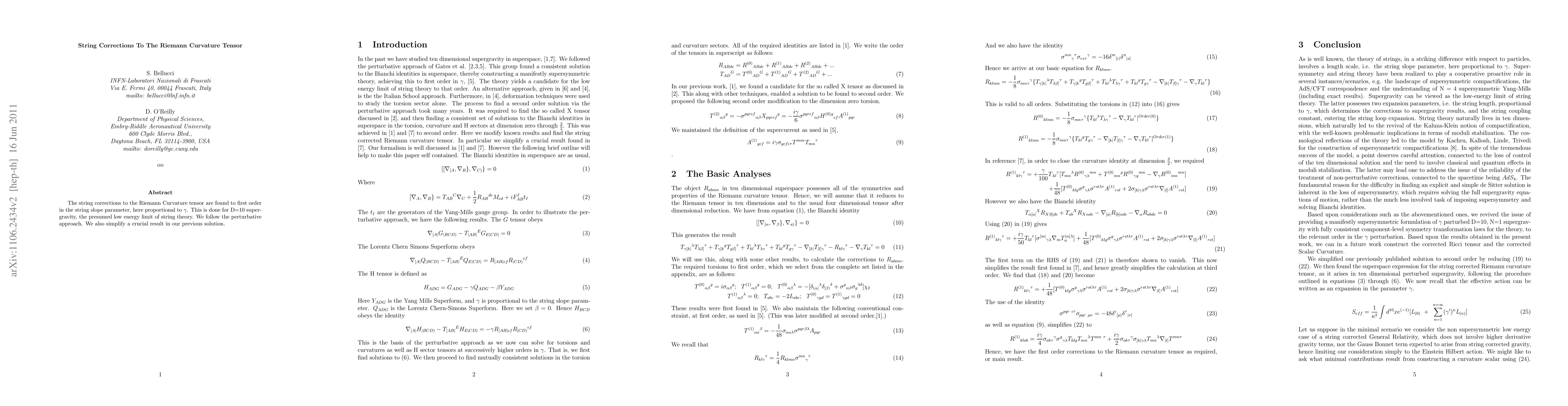 The string corrections to the Riemann Curvature tensor are found to first order in the string slope parameter, here proportional to $\g$. This is done for D=10 supergravity, the presumed low energy limit of string theory. We follow the perturbative approach. We also simplify a crucial result in our previous solution.