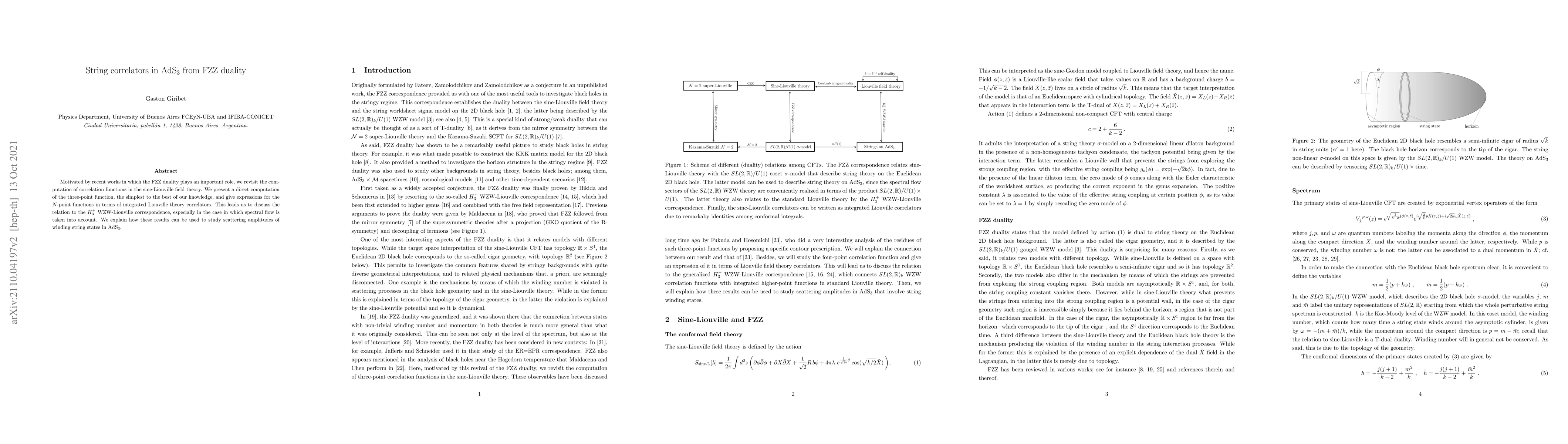 This paper computes correlation functions in sine-Liouville field theory using FZZ duality, deriving expressions for $N$-point functions and discussing their relation to the $H^+_3$ WZW-Liouville correspondence, particularly under spectral flow, to study scattering amplitudes of winding string states in AdS$_3$.