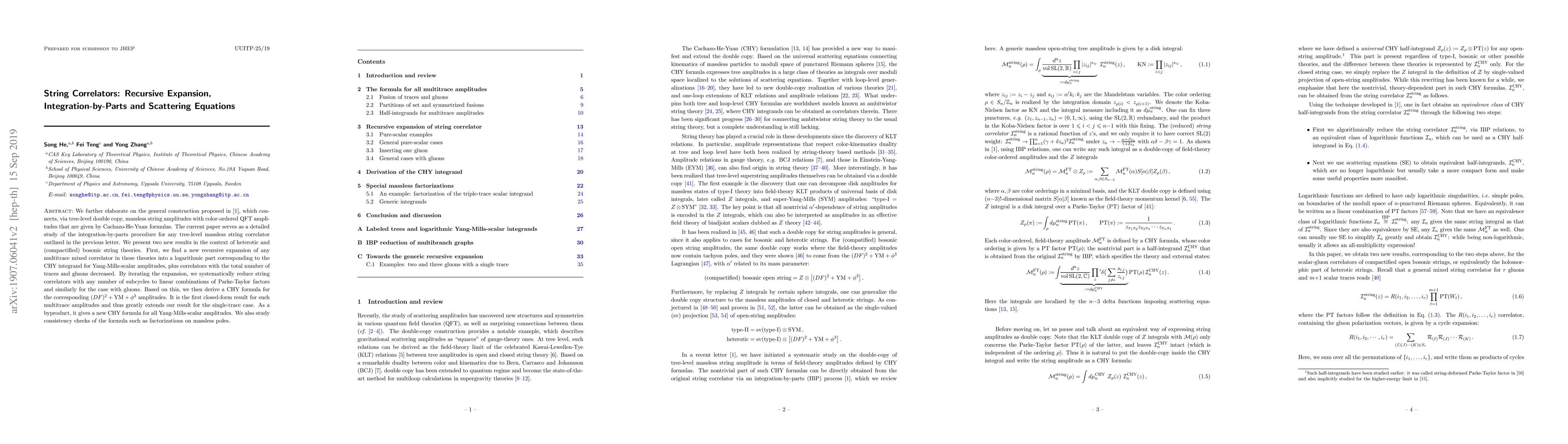 We further elaborate on the general construction proposed in arXiv:1812.03369, which connects, via tree-level double copy, massless string amplitudes with color-ordered QFT amplitudes that are given by Cachazo-He-Yuan formulas. The current paper serves as a detailed study of the integration-by-parts procedure for any tree-level massless string correlator outlined in the previous letter. We present two new results in the context of heterotic and (compactified) bosonic string theories. First, we find a new recursive expansion of any multitrace mixed correlator in these theories into a logarithmic part corresponding to the CHY integrand for Yang-Mills-scalar amplitudes, plus correlators with the total number of traces and gluons decreased. By iterating the expansion, we systematically reduce string correlators with any number of subcycles to linear combinations of Parke-Taylor factors and similarly for the case with gluons. Based on this, we then derive a CHY formula for the corresponding $(DF)^2 + {\rm YM} + \phi^3$ amplitudes. It is the first closed-form result for such multitrace amplitudes and thus greatly extends our result for the single-trace case. As a byproduct, it gives a new CHY formula for all Yang-Mills-scalar amplitudes. We also study consistency checks of the formula such as factorizations on massless poles.