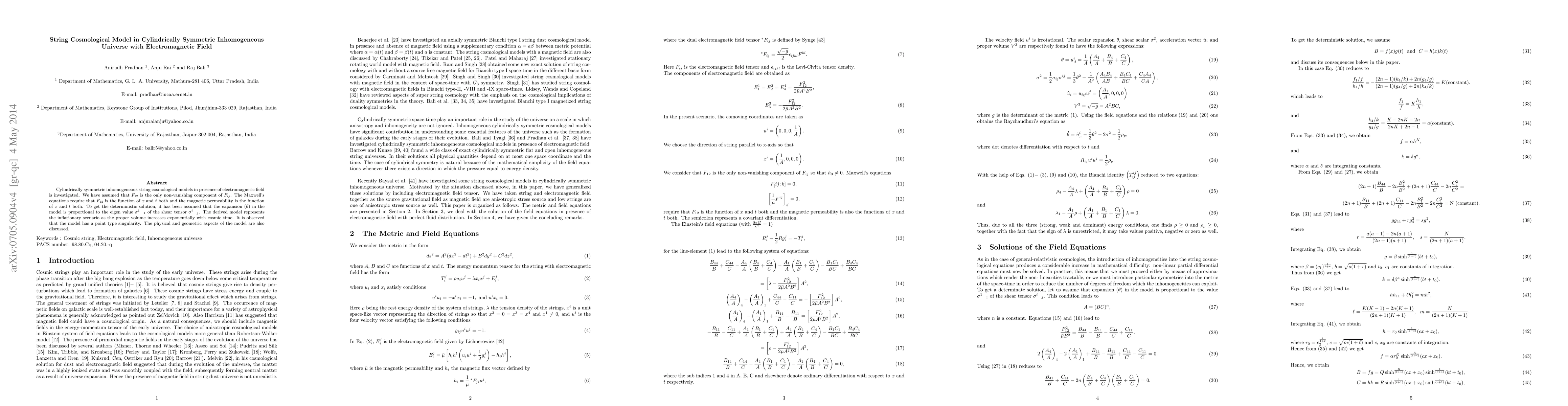 This paper investigates cylindrically symmetric inhomogeneous string cosmological models with an electromagnetic field, deriving a solution where the expansion is proportional to the shear tensor's eigenvalue. The model exhibits exponential volume growth, indicative of an inflationary scenario, and features a point type singularity.