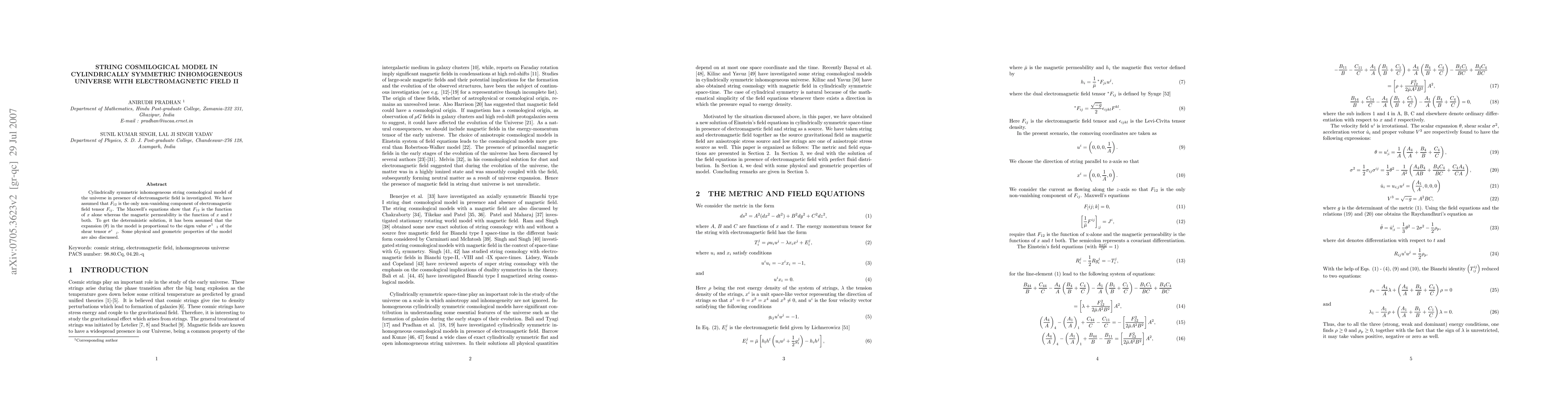 This paper explores a cylindrically symmetric, inhomogeneous string cosmological model with an electromagnetic field, assuming F_{12} as the only non-zero component of the electromagnetic field tensor. The model's expansion is linked to the shear tensor's eigenvalue, leading to a deterministic solution, and discusses its physical and geometric properties.