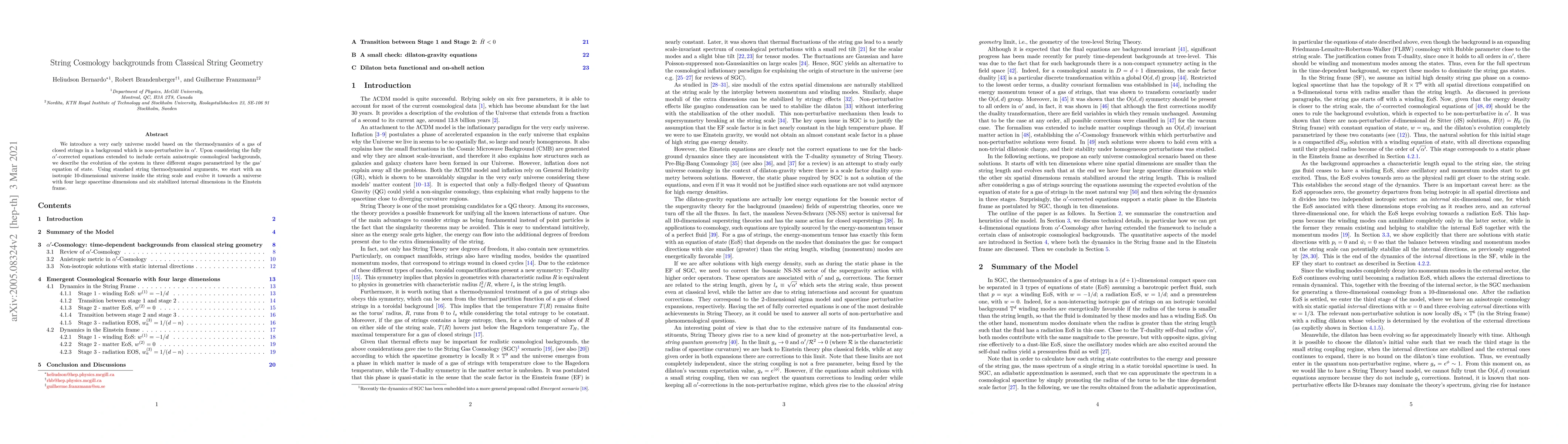 We introduce a very early universe model based on the thermodynamics of a gas of closed strings in a background which is non-perturbative in $\alpha'$. Upon considering the fully $\alpha'$-corrected equations extended to include certain anisotropic cosmological backgrounds, we describe the evolution of the system in three different stages parametrized by the gas' equation of state. Using standard string thermodynamical arguments, we start with an isotropic 10-dimensional universe inside the string scale and evolve it towards a universe with four large spacetime dimensions and six stabilized internal dimensions in the Einstein frame.