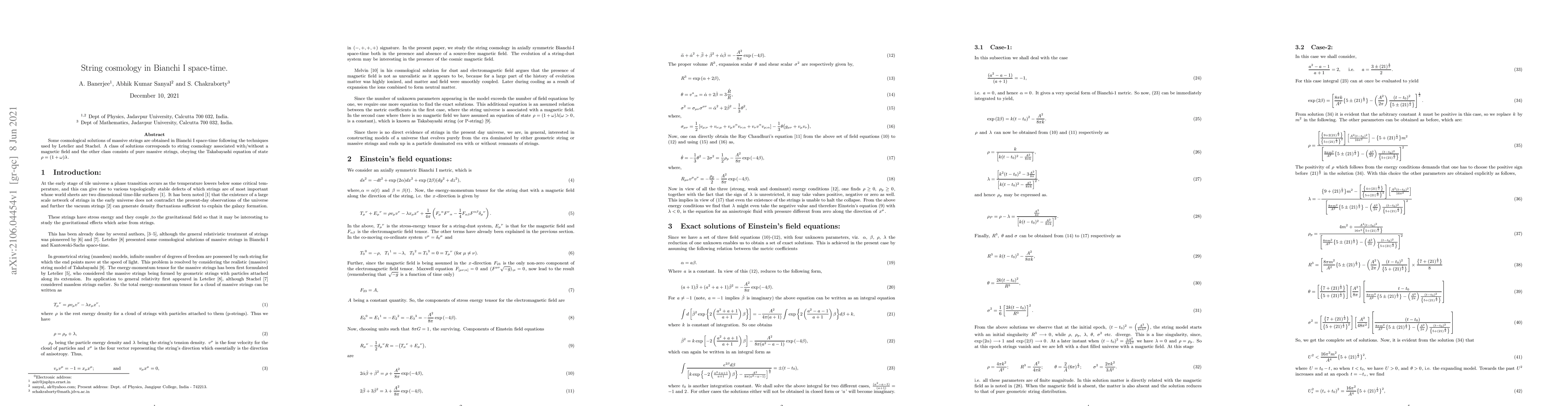 This paper explores cosmological solutions involving massive strings in Bianchi I space-time, deriving models that include string cosmologies with and without magnetic fields, alongside pure massive strings adhering to the Takabayashi equation of state.