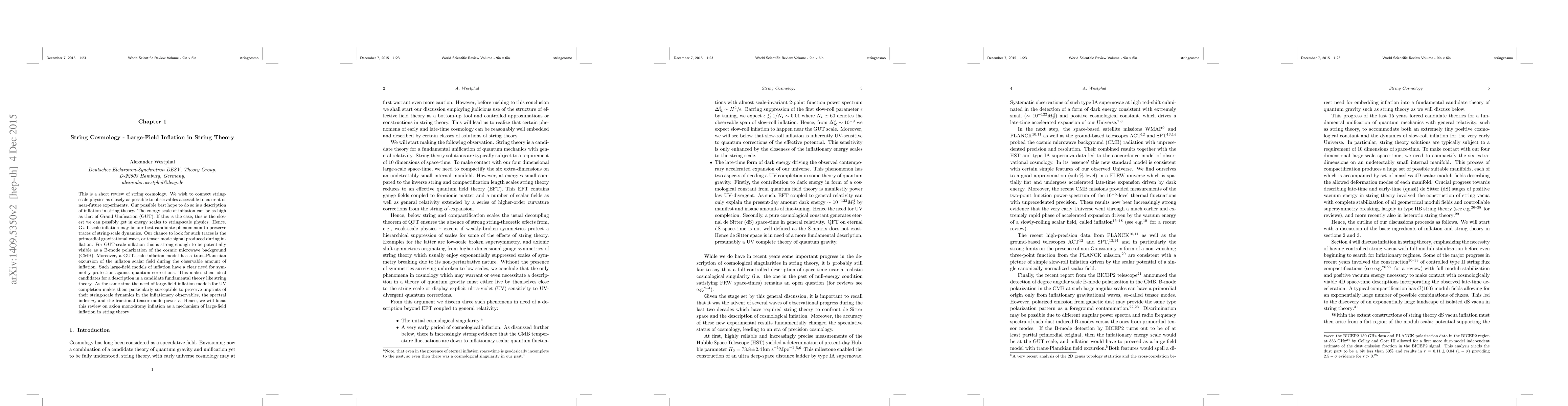 The paper reviews string cosmology with a focus on large-field inflation in string theory, connecting string-scale physics to observable phenomena like primordial gravitational waves (B-mode polarization of CMB).