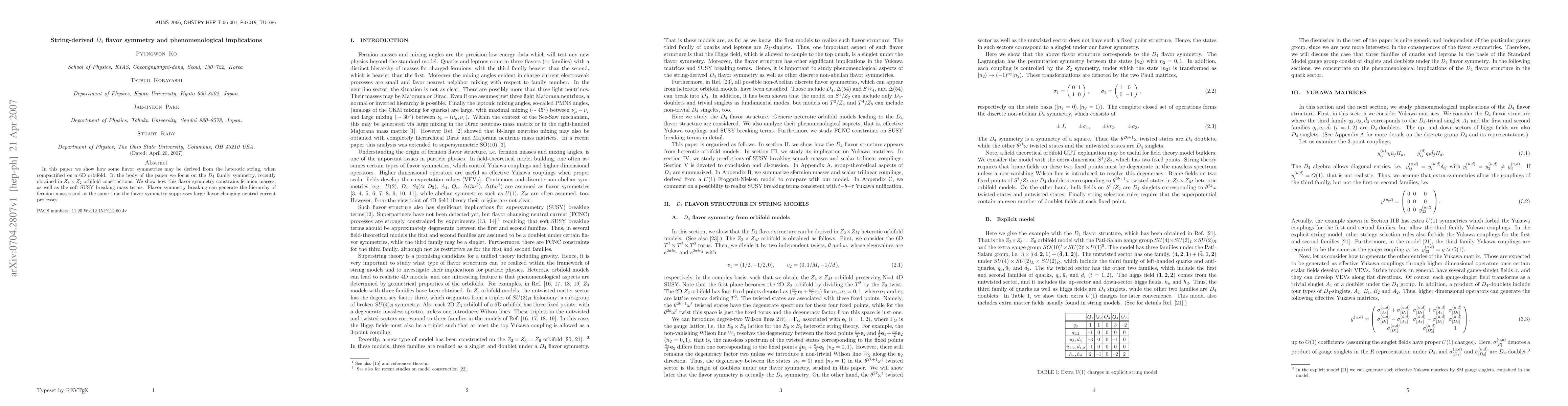 This paper explores the derivation of $D_4$ flavor symmetry from heterotic string compactification on a 6D orbifold, demonstrating how it constrains fermion masses and soft SUSY breaking terms while suppressing large flavor changing neutral currents.