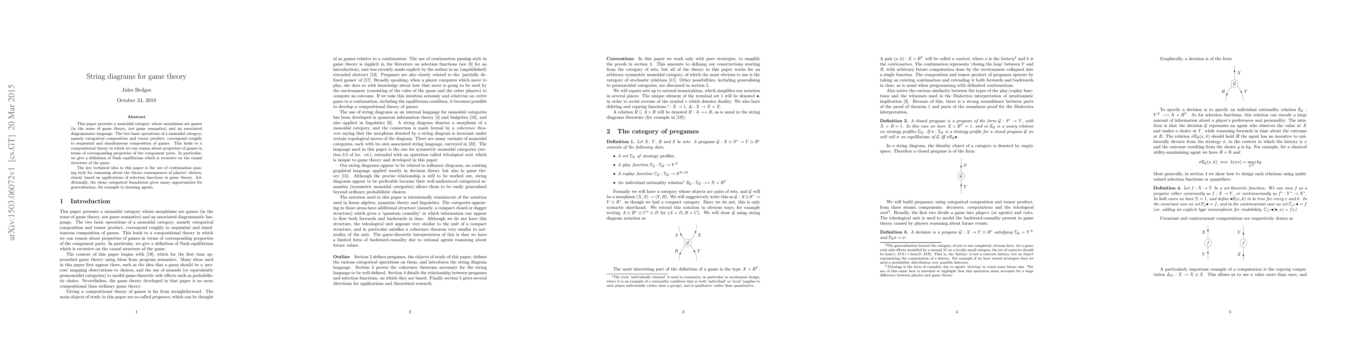 This paper introduces a monoidal category for game theory where games are represented as morphisms, enabling a diagrammatic language for reasoning about game composition. It defines a recursive Nash equilibrium based on the causal structure of the game, using continuation passing style and selection functions for future consequence reasoning.